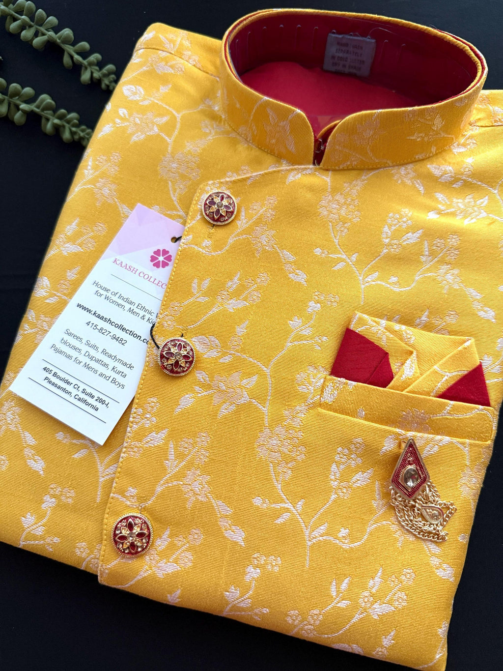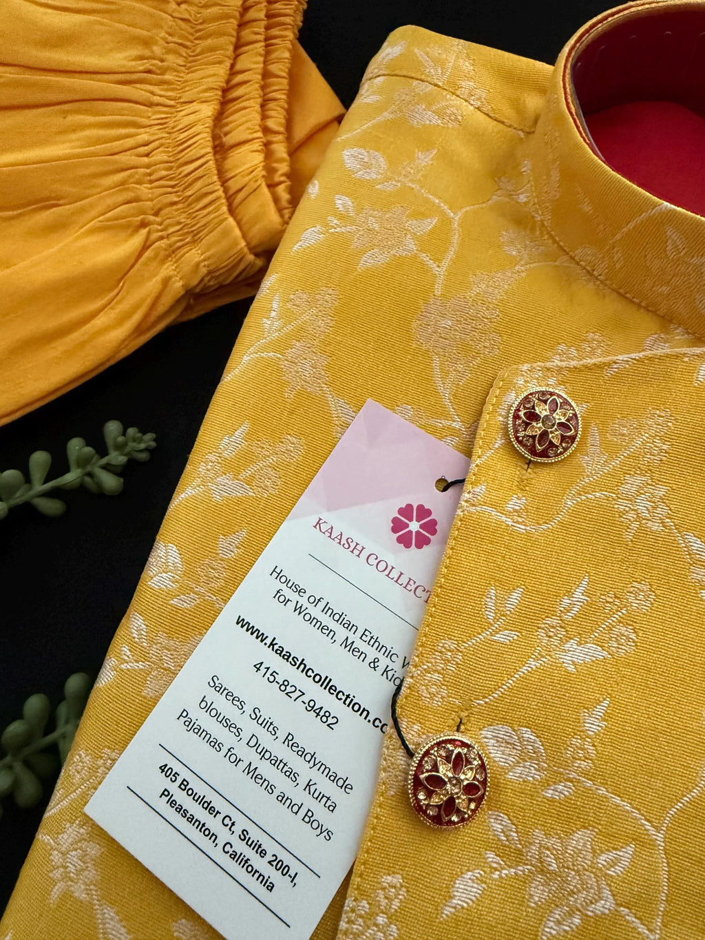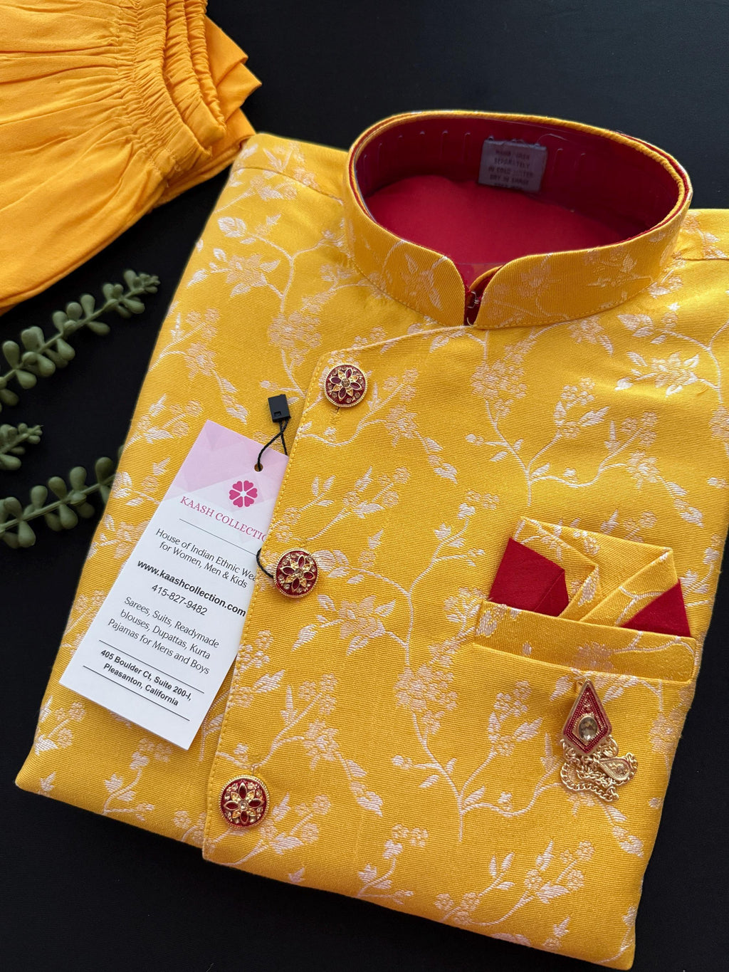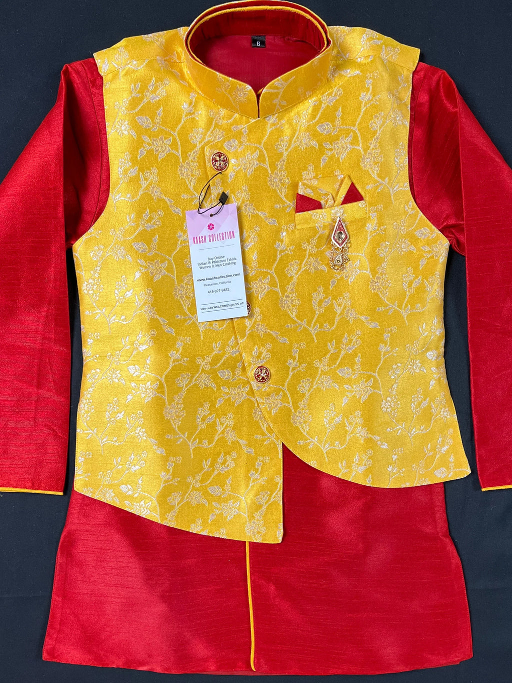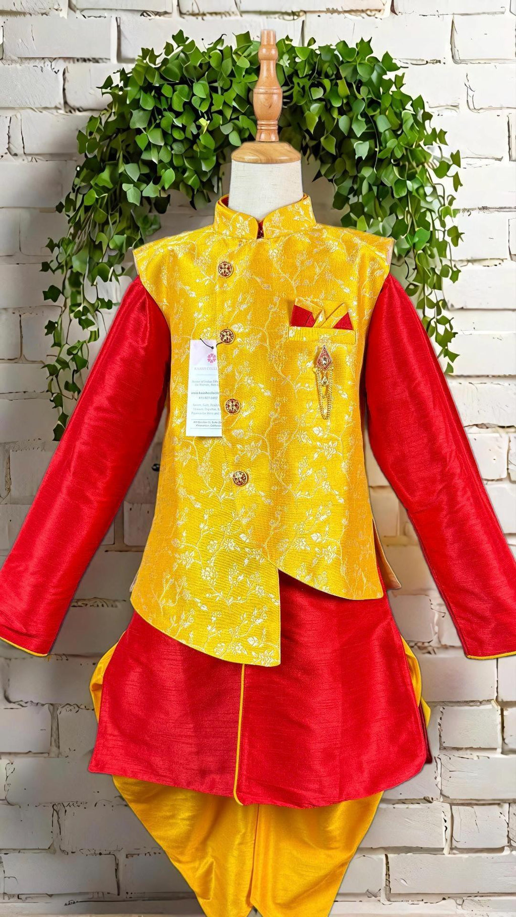 Boys Kurta Pajama Set with Jacket in Floral Weave Work. Yellow color Jacket with Floral Weaving Work with matching Kurta Brooch and buttons. The bottom is a matching color Balloon style. The Combination of Red, Maroon and Yellow makes the Kurta wearable for all the occasion.