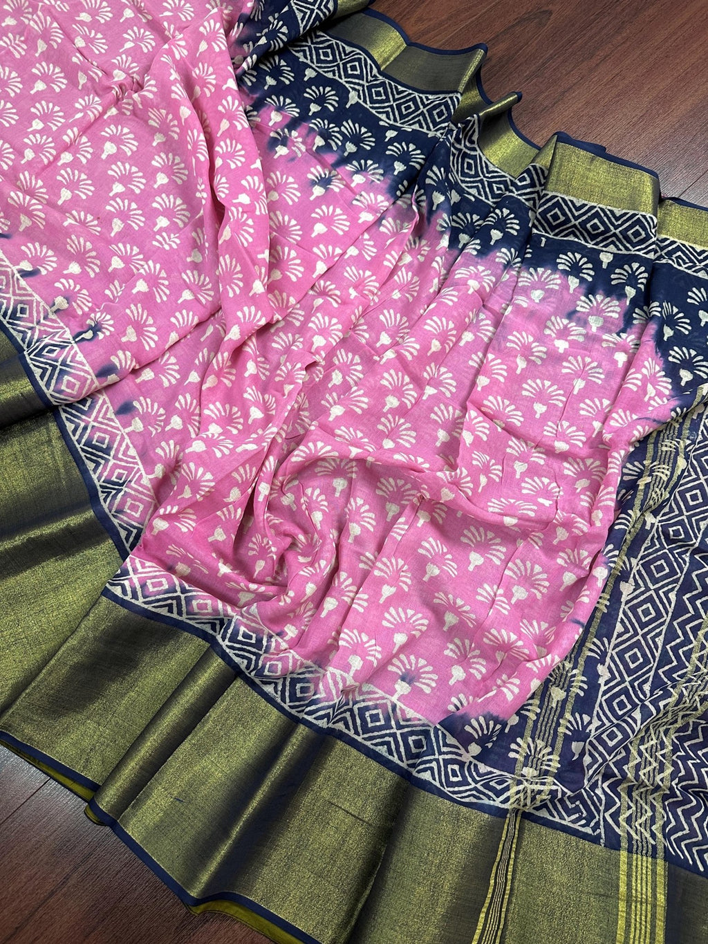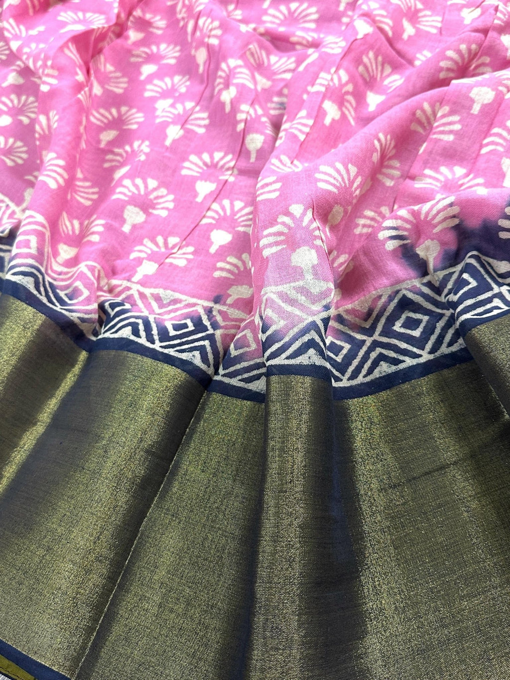 Pure Khaadi Linen Cotton Saree in Baby Pink and Blue Color with Tissue Wide Border.