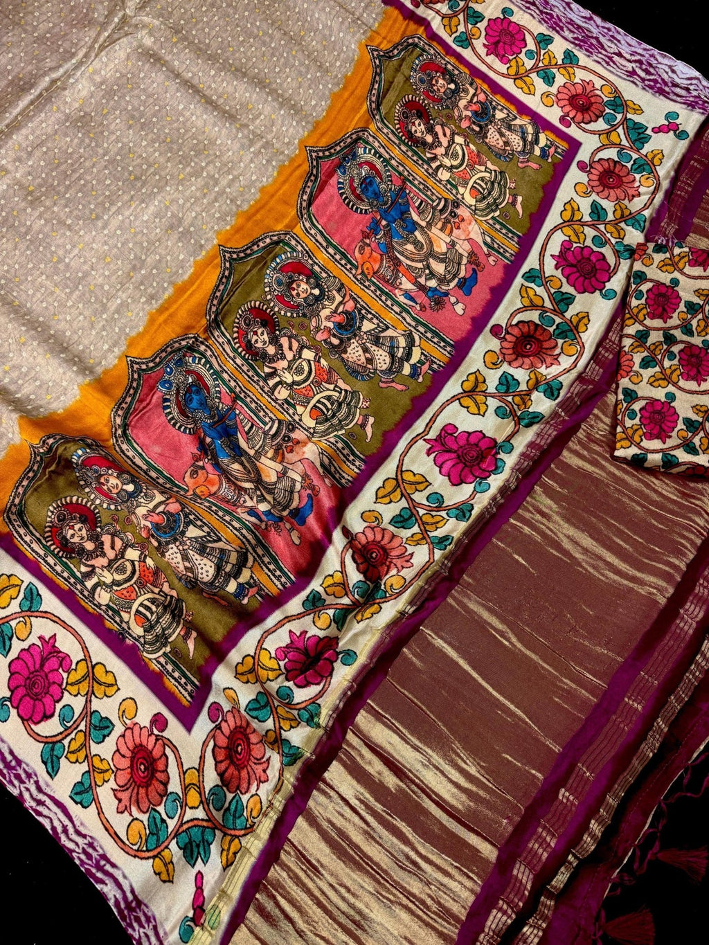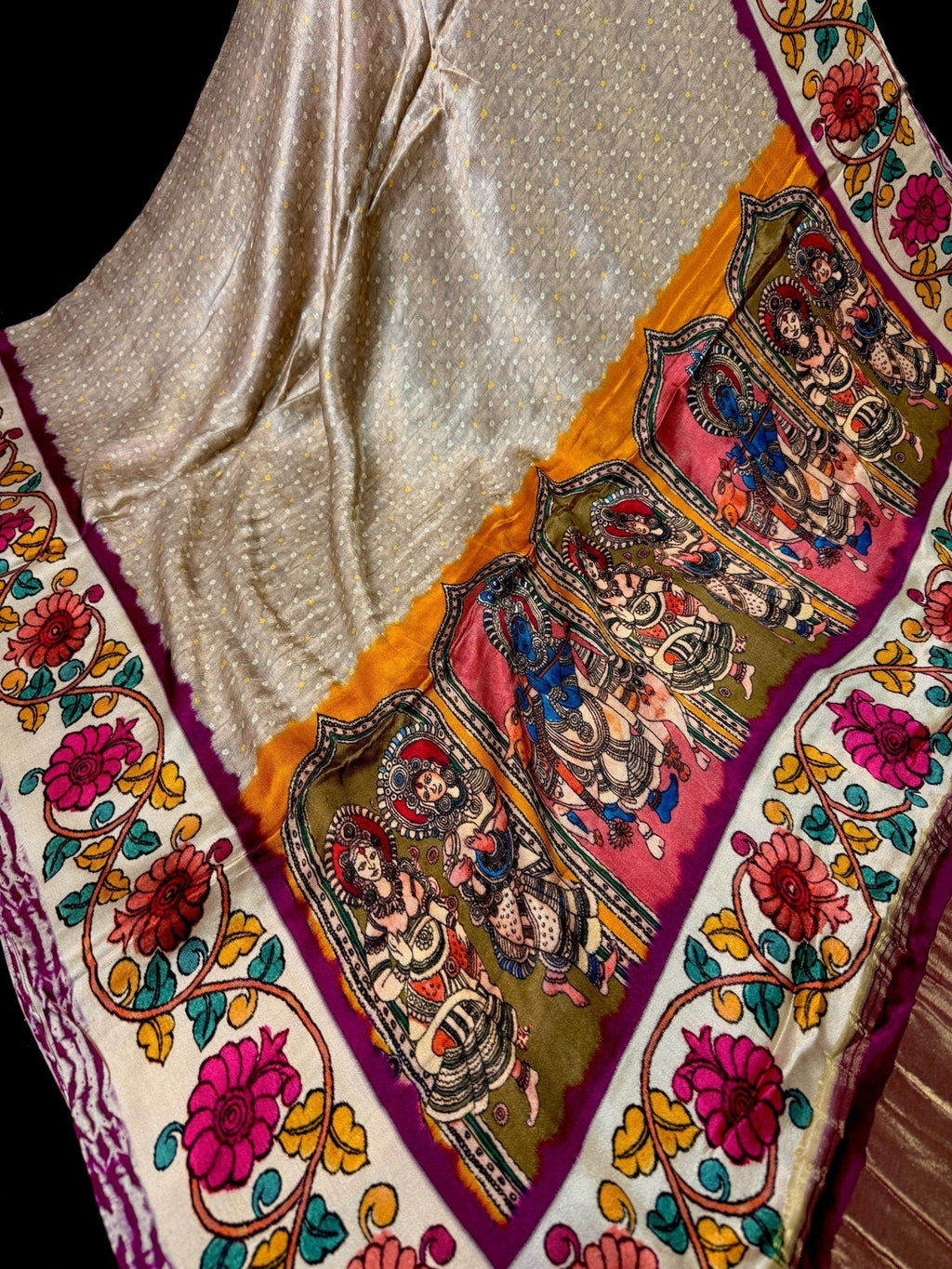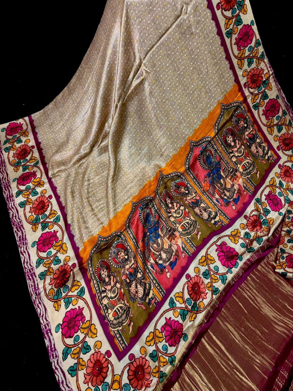 Celebrate timeless artistry with this elegant Beige Gold Gajji Silk Saree, beautifully crafted with traditional Bandhej Bandhani techniques and adorned with classic Pichwai prints. Made from luxurious pure Gajji silk, this saree offers a rich texture, soft sheen, and graceful drape, making it perfect for festive and cultural occasions.