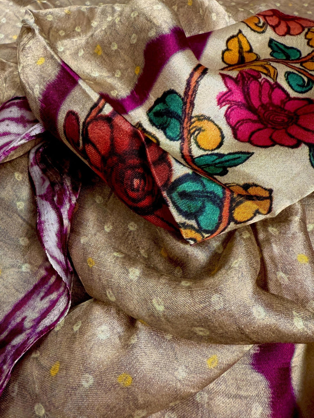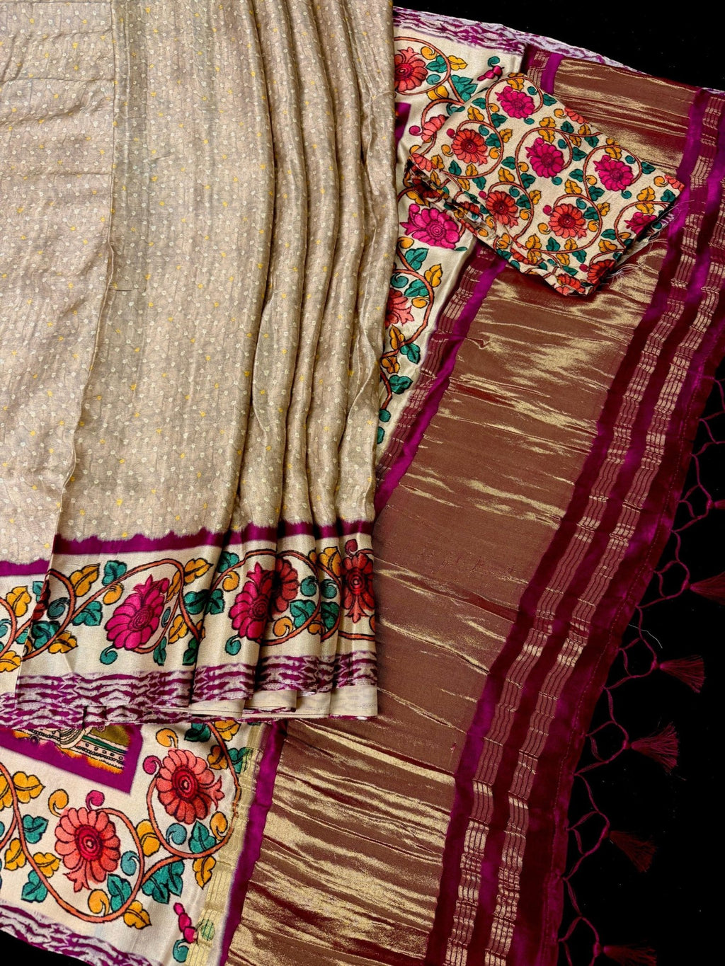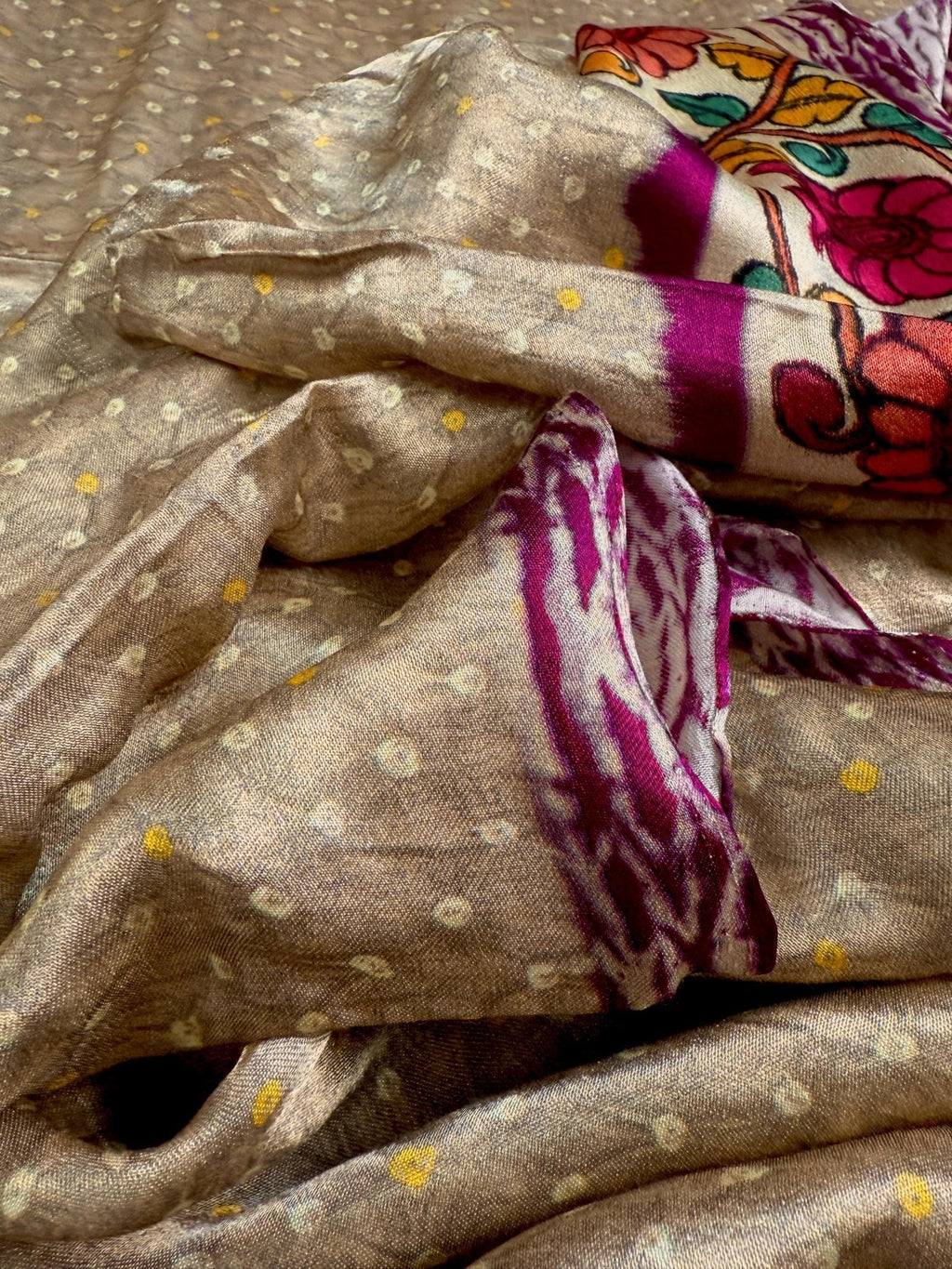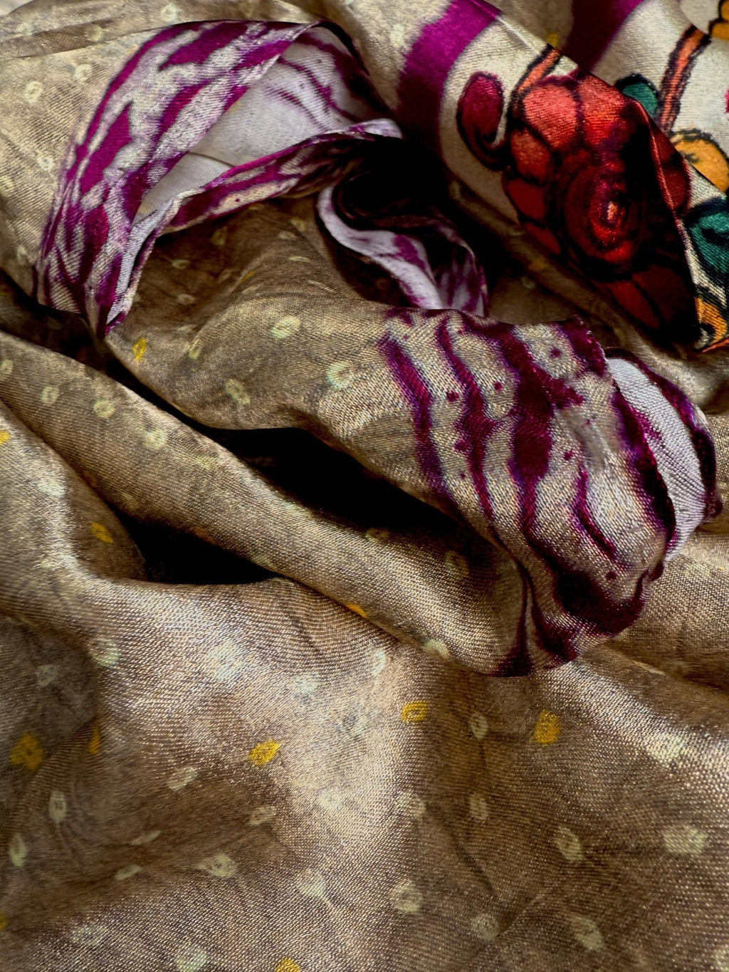 Beige Gold Silk Saree – Bandhej bandhani and with Floral Print Saree