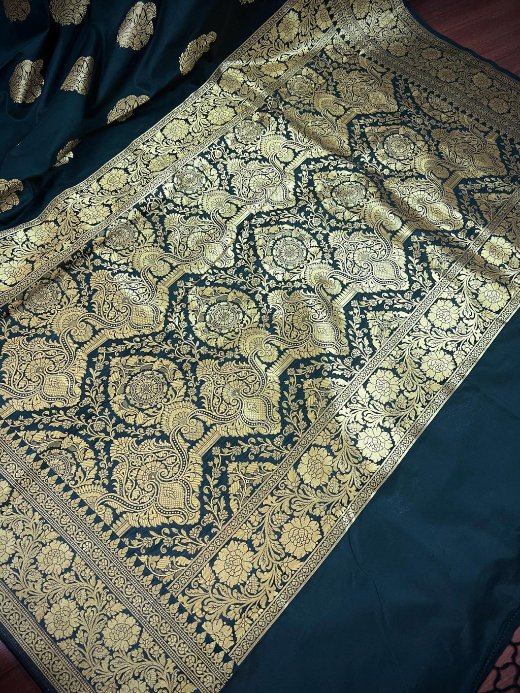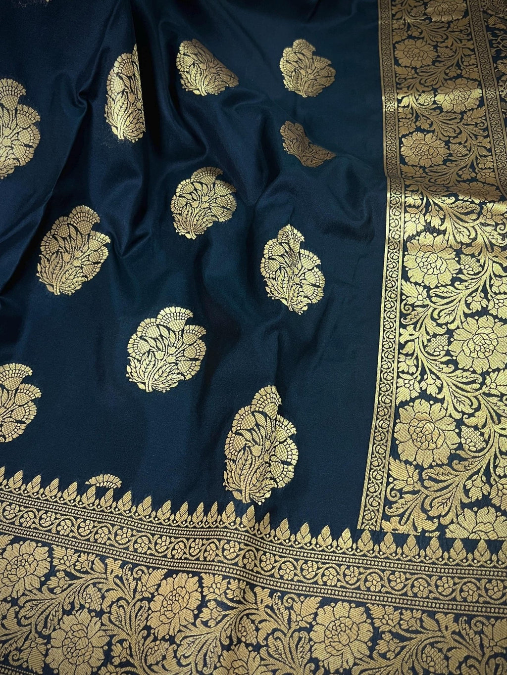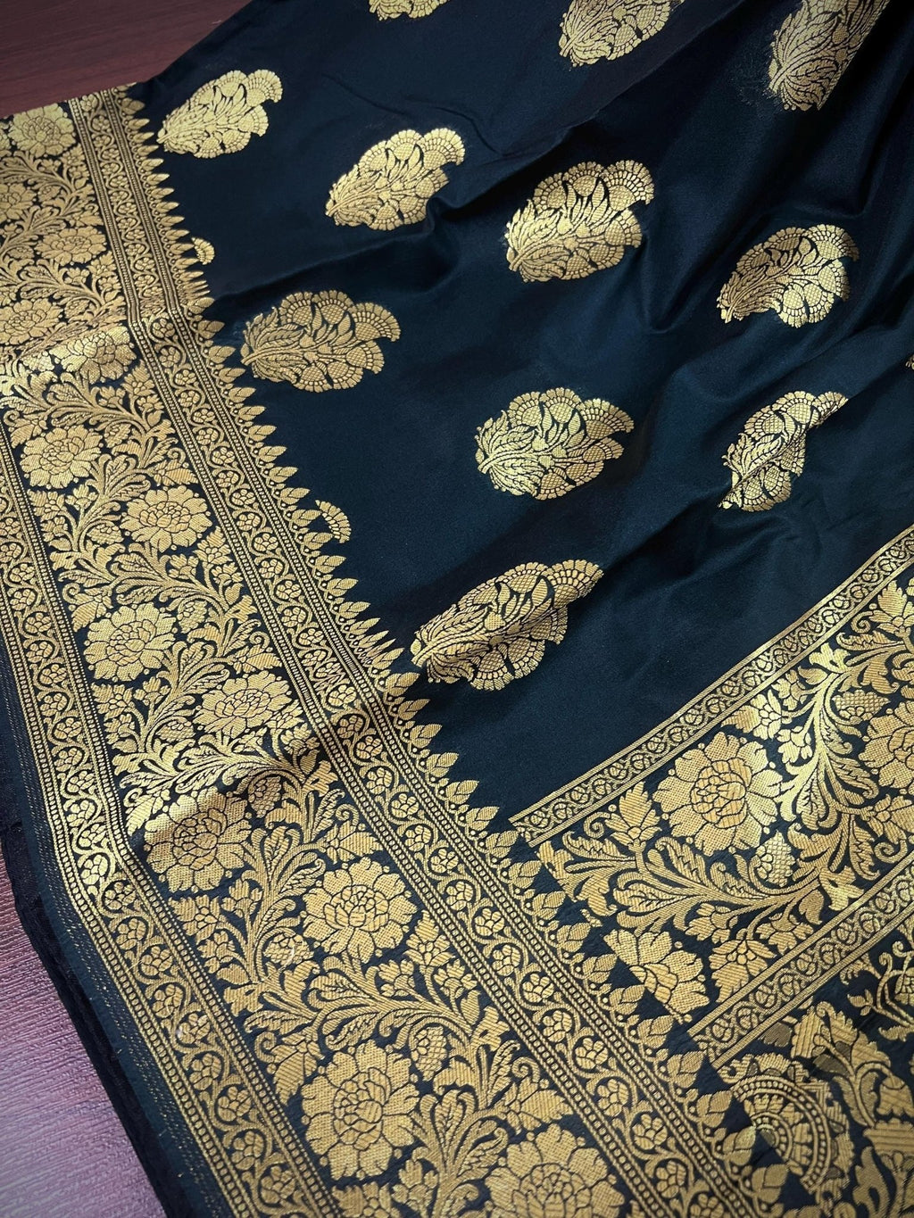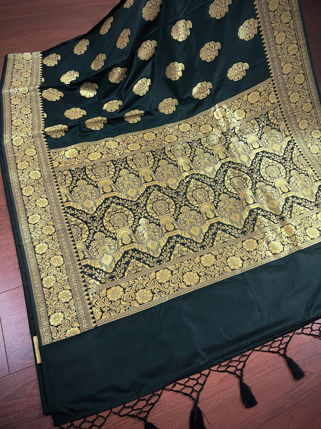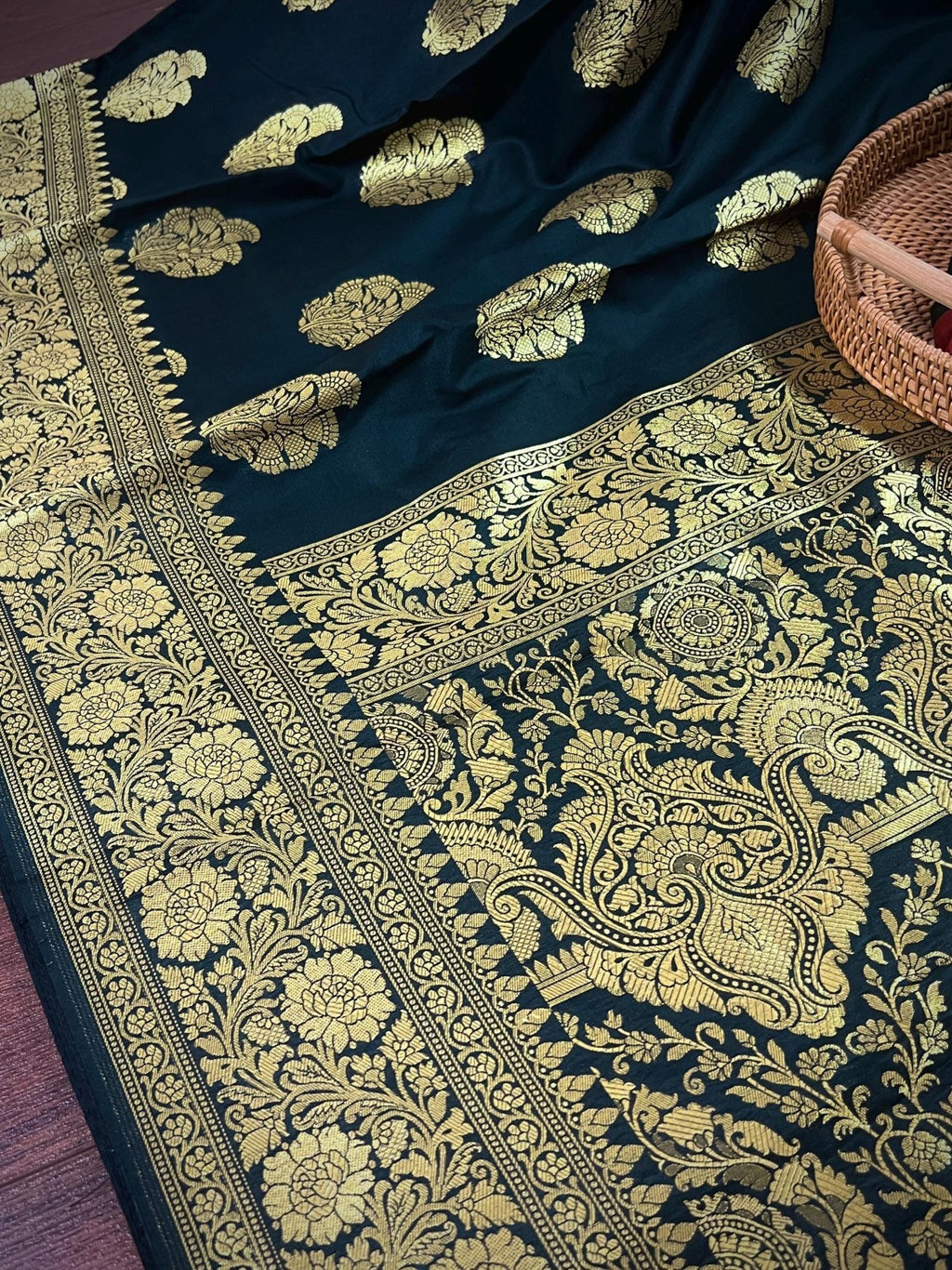 Black Color Traditional Banarasi Handloom Silk Saree in Muted Yellow Gold Muted Zari Weave