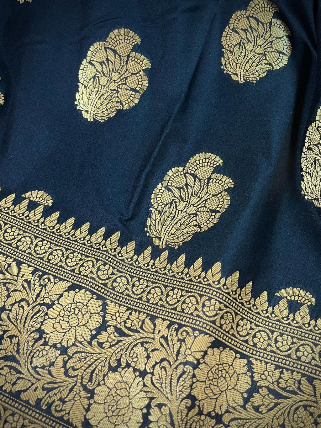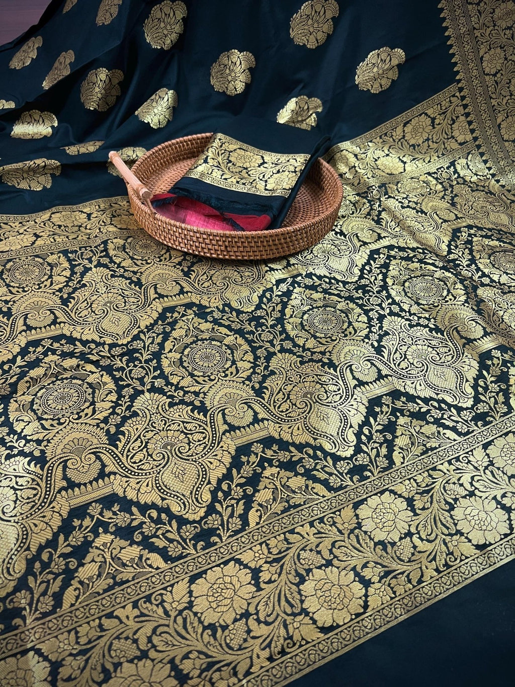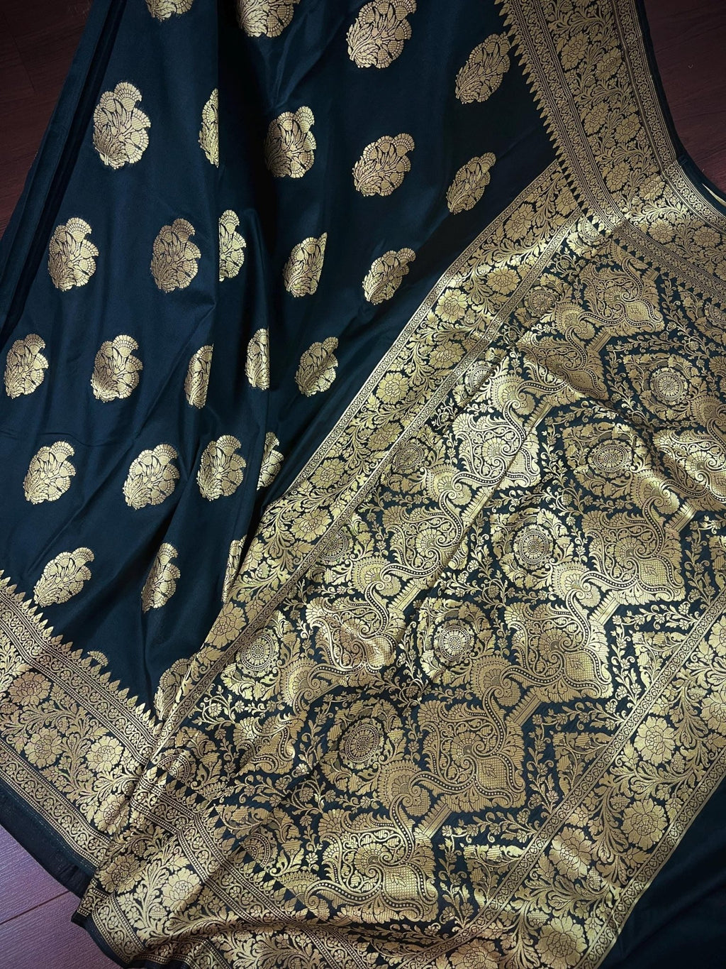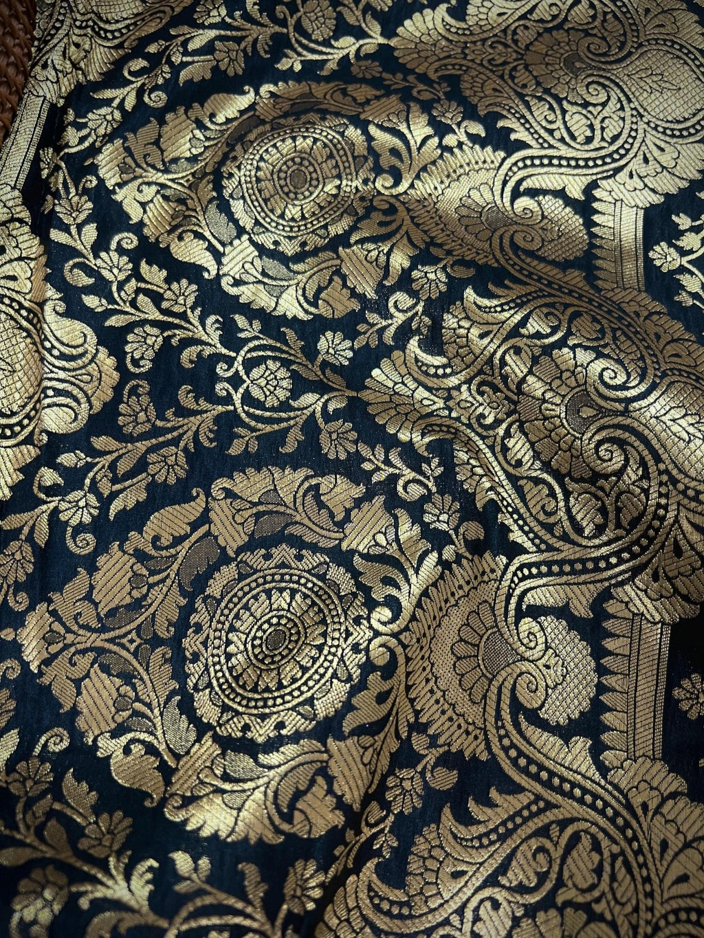 Sabyasachi Inspired latest Black Color Handloom Banarasi Silk Saree with Grand Pallu in Yellow Gold Muted Zari Weave.