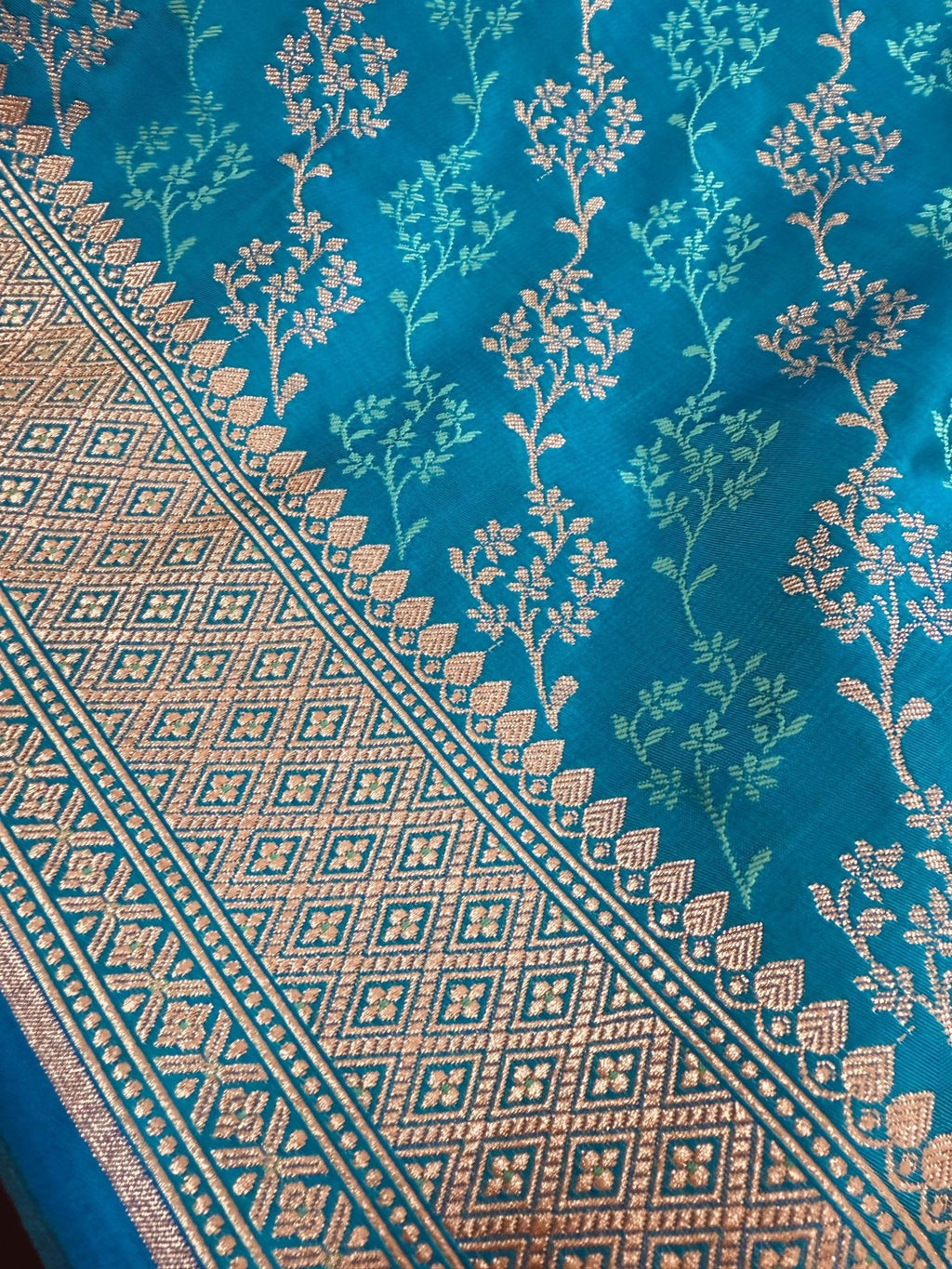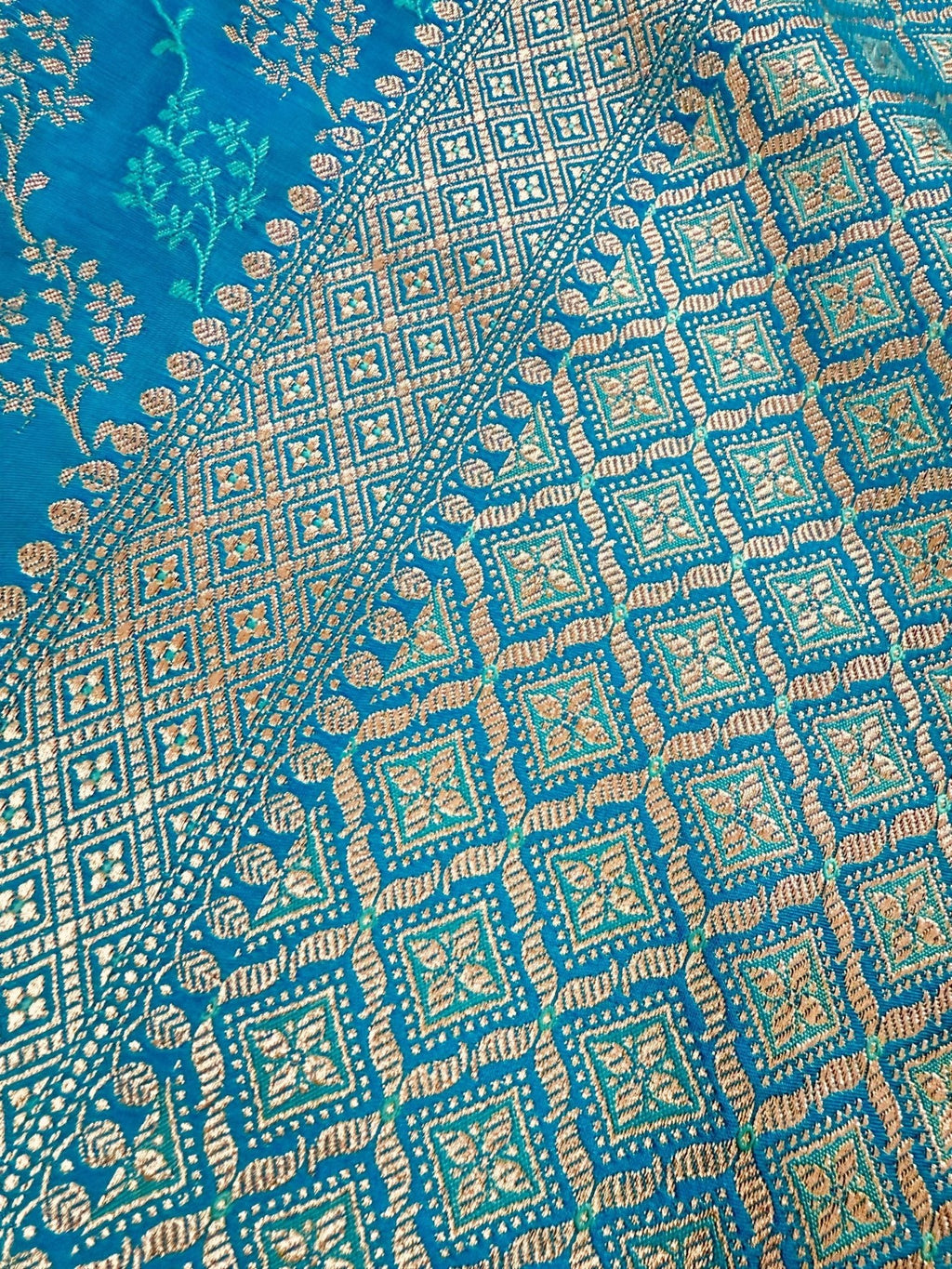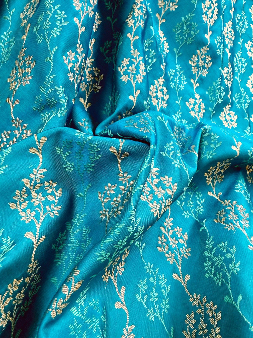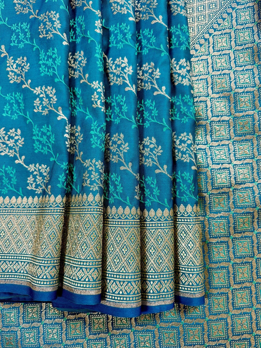 This Saree is a Sheer Beauty. Handmade Firozi Color Saree with Tanchoi Floral Pattern with Muted Gold Zari. Material is soft Mashru Silk. Saree is Light in weight and soft. Borders and Pallu is Banarasi.