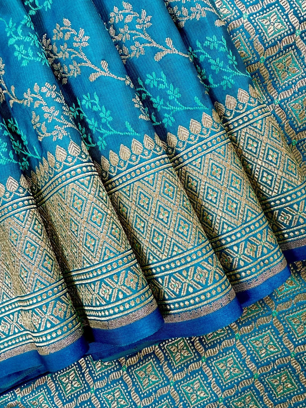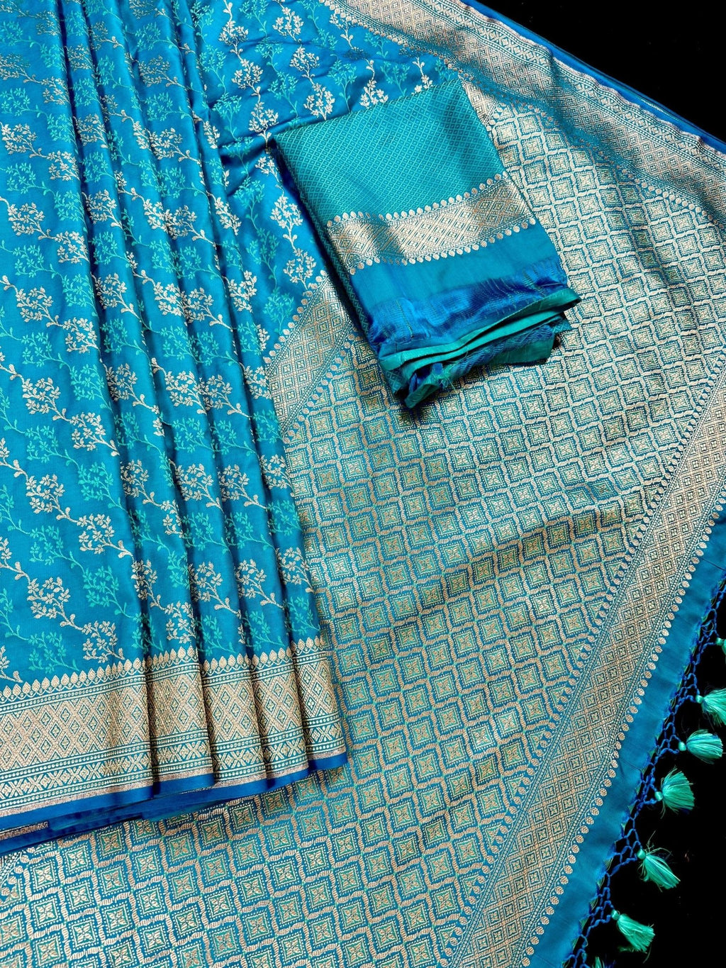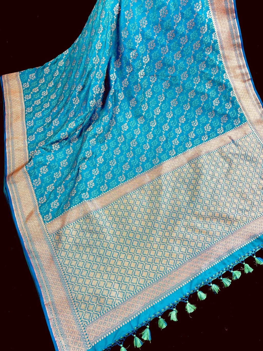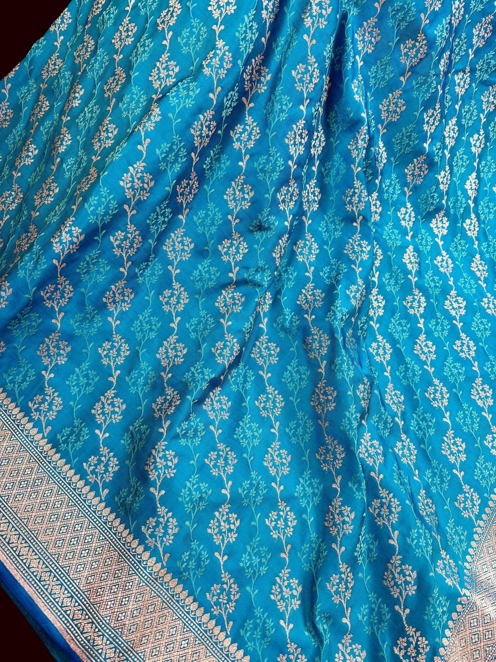 This Saree is a Sheer Beauty. Handmade Firozi Color Saree with Tanchoi Floral Pattern with Muted Gold Zari. Material is soft Mashru Silk. Saree is Light in weight and soft. Borders and Pallu is Banarasi.