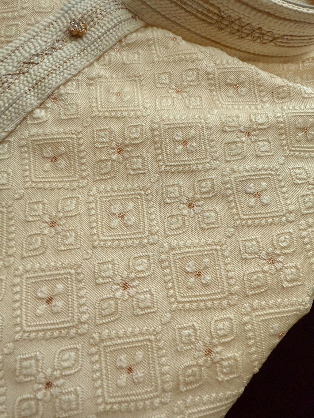 Cream Color Men Kurta Pajama with Embossed Embroidery and Zari