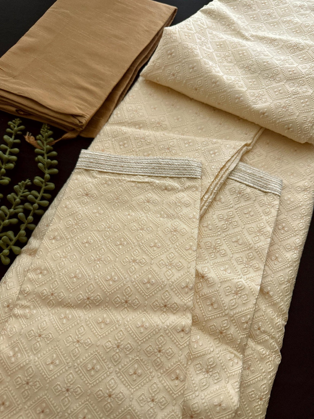 Designer Men's Kurta Pajama Set with Embossed design pattern with small zari buttis all over the Kurta and fancy neckline