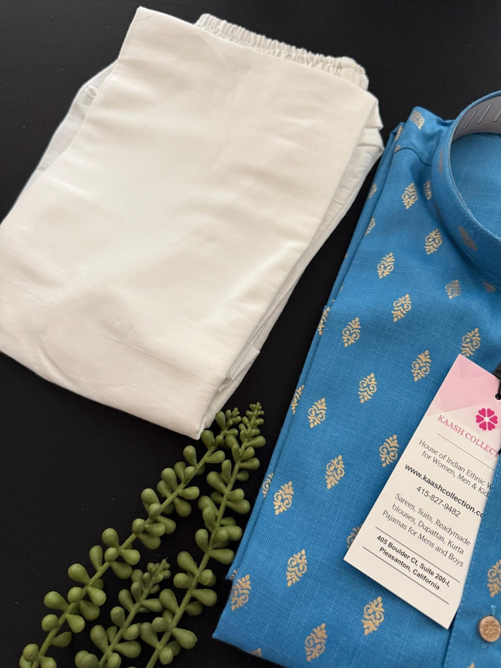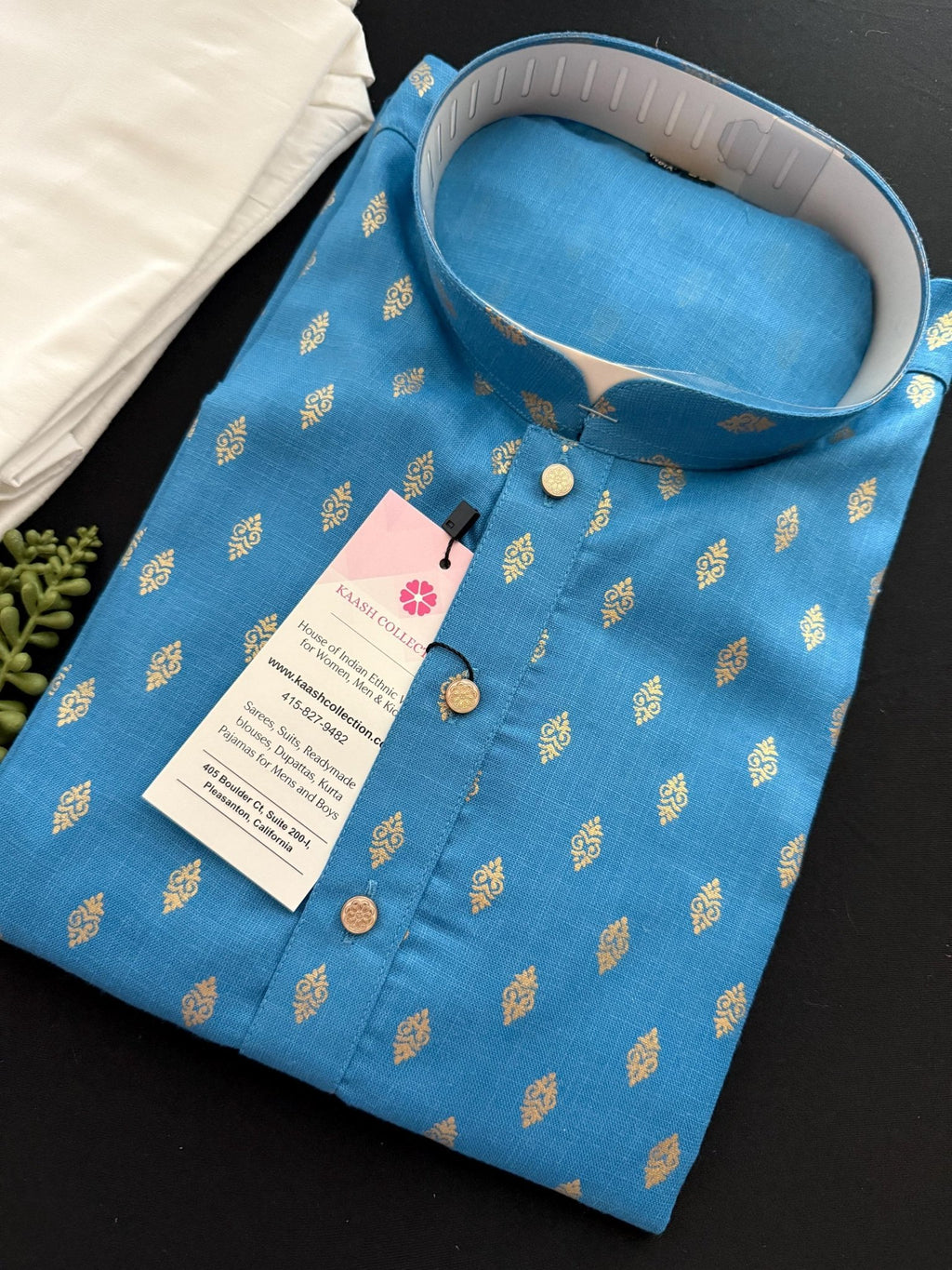 Deep Sky Blue Color Premium Pure Cotton Mens Kurta Pajama Set with small Self design Butti