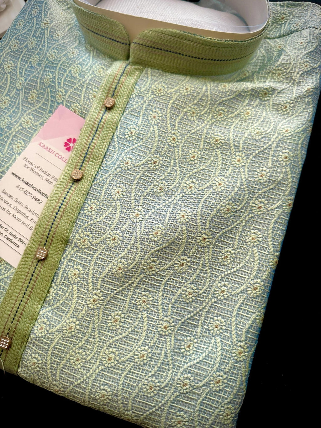 Designer Pastel Sea Green Men's Kurta with bottom with Embossed Embroidery Work