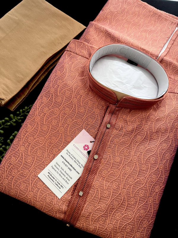 Designer Peach Color with undertone of Blue Men's Kurta with bottom with Embossed Embroidery Work