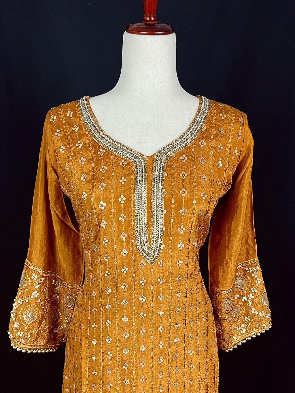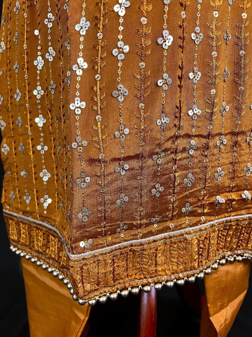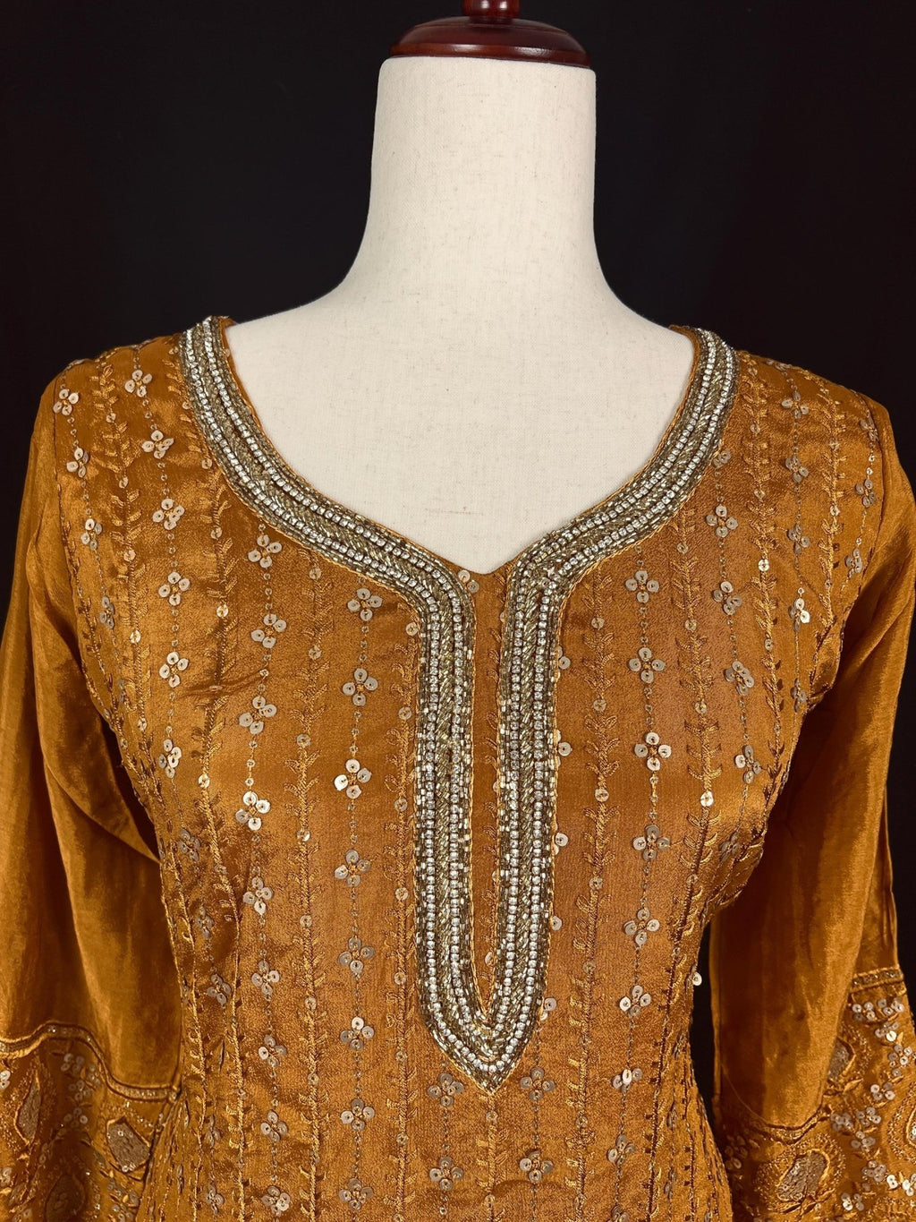 Gorgeous Mustad Gold Color 3pcs Readymade Suit for Women in Pure Chinnon. Premium Quality and very soft and Flowy material.
