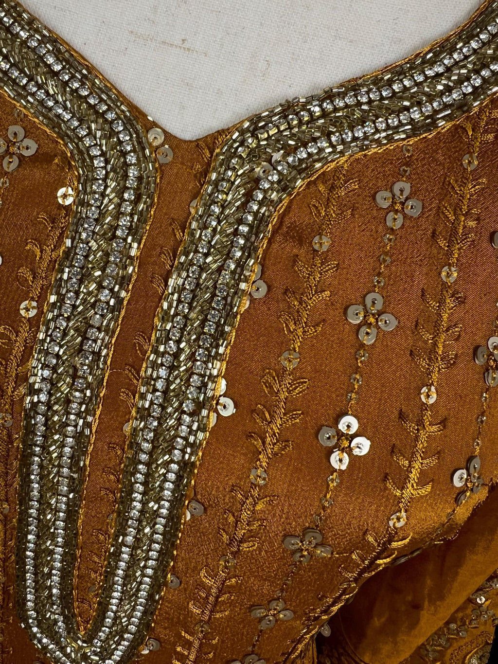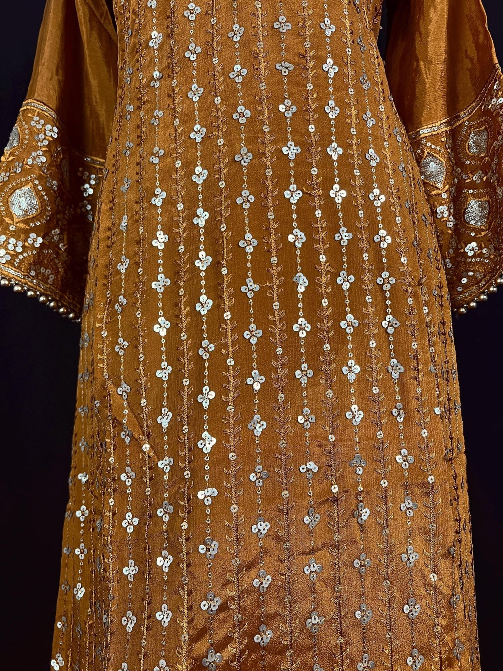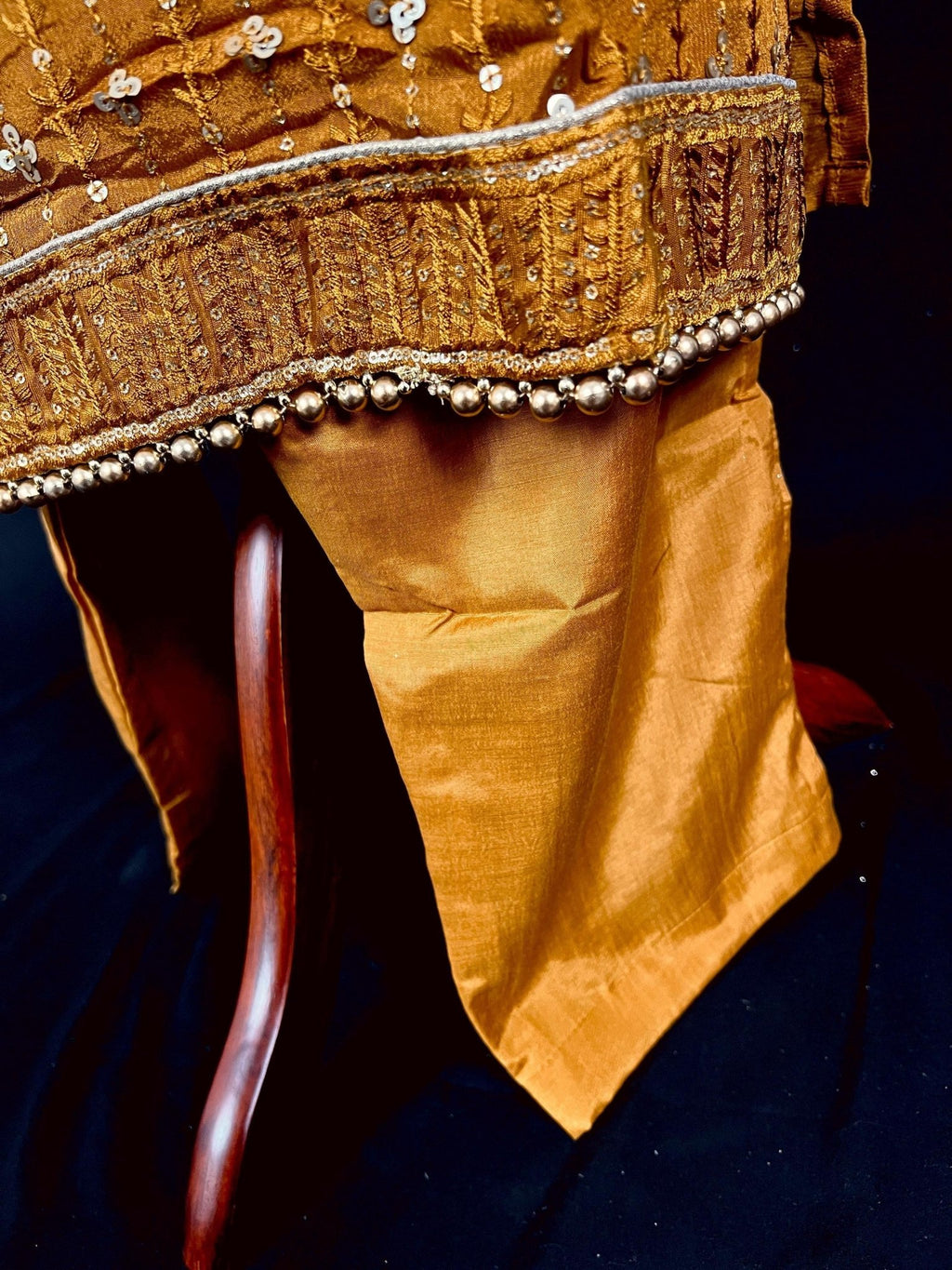 Gorgeous Mustad Gold Color 3pcs Readymade Suit for Women in Pure Chinnon. Premium Quality and very soft and Flowy material.