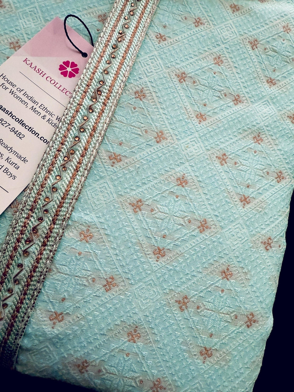 Introducing the Grand Pastel Sea Blue Color Men Kurta Pajama, a perfect blend of elegance and tradition. This exquisite men ethnic wear features a gorgeous design pattern intricately embedded with delicate zari weave work, adding a royal touch to your wardrobe. Crafted for those special occasions, this kurta pajama set is ideal for wedding wear, festive celebrations, and cultural events. The pastel sea blue color offers a fresh, calming appeal while the zari detailing highlights the rich craftsmanship. Comfortable yet stylish, this kurta pajama ensures you stand out effortlessly at any event. Whether paired with traditional accessories or contemporary footwear, this ensemble embodies sophistication and grace. Elevate your ethnic collection with this stunning men kurta pajama that perfectly balances style and comfort. Perfect for weddings, festivals, and special occasions, this set promises a regal look every time you wear it.