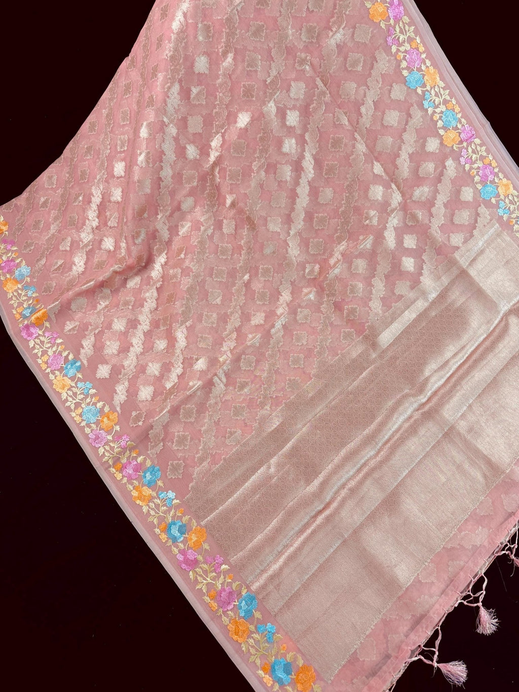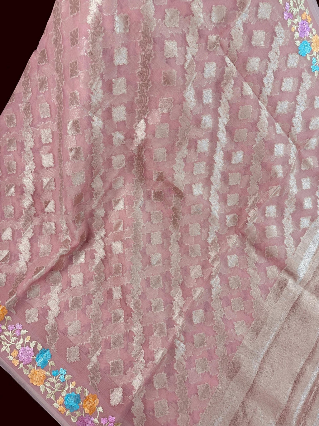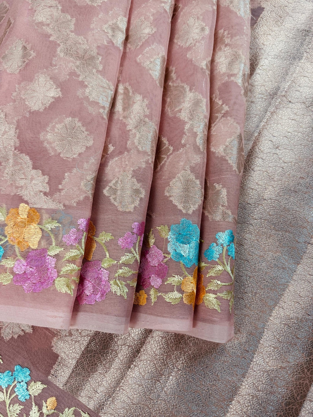 Handmade Dusty Pink Color Soft Banarasi Kora Silk Saree with Muted Gold Zari Weave and Floral Embroidery