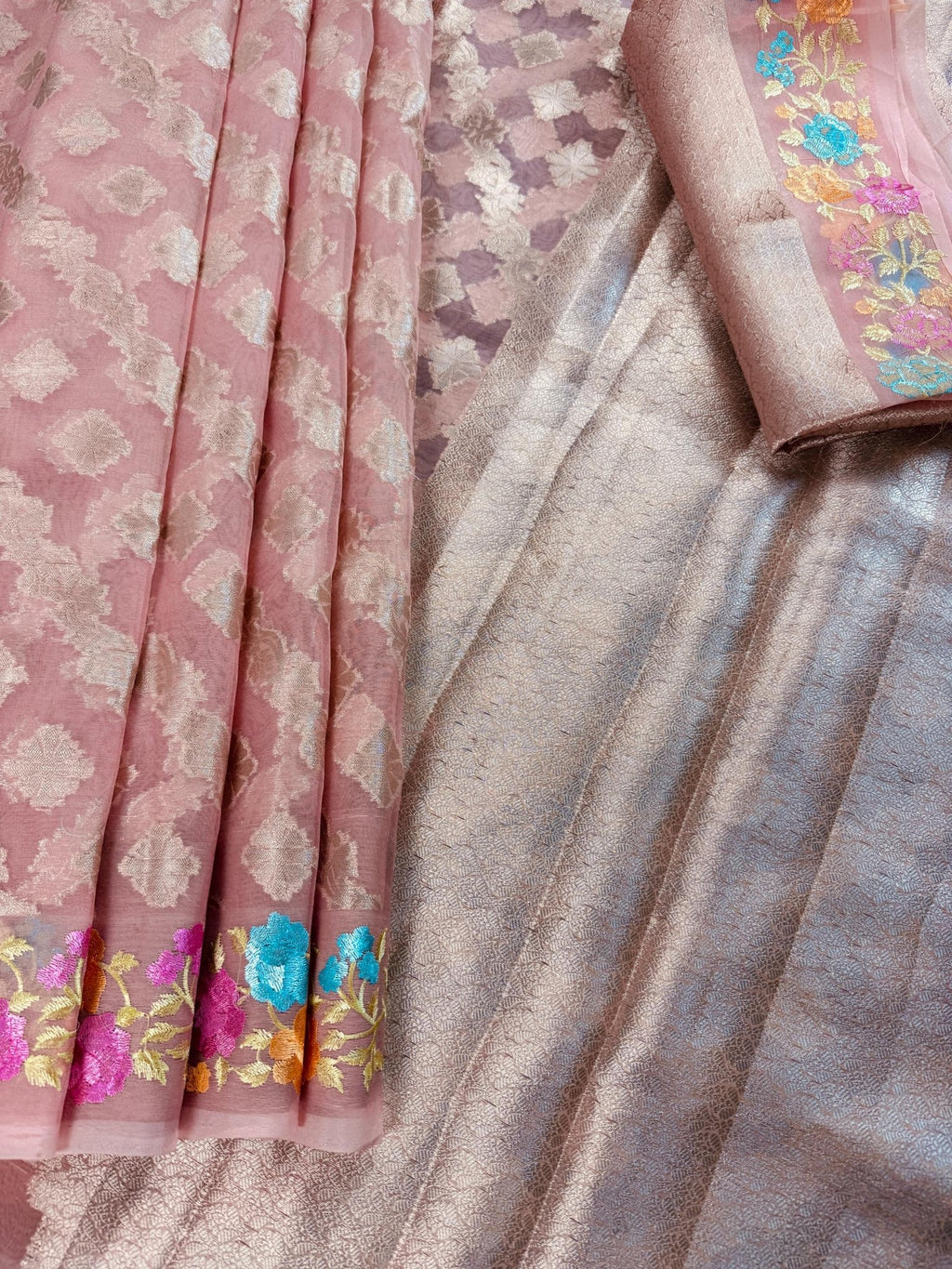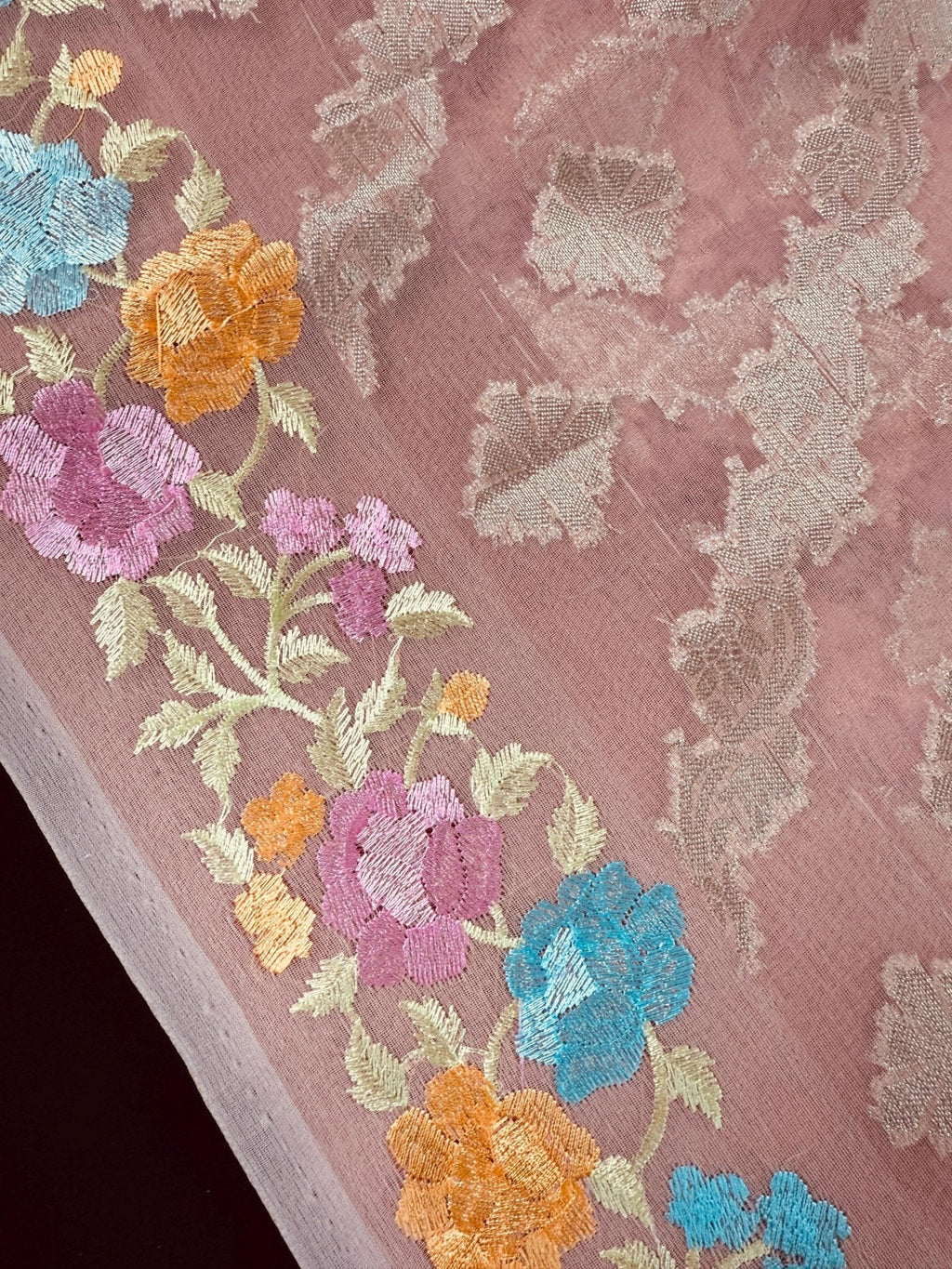 The saree features a subtle muted gold zari weave that adds a soft, understated shimmer, enhancing its luxurious appeal. Delicate floral embroidery is thoughtfully placed across the saree, bringing a romantic and feminine touch while complementing the classic Banarasi weave. The dusty pink hue exudes elegance, making this Banarasi Kora silk saree perfect for weddings, receptions, festive celebrations, and elegant daytime events.
