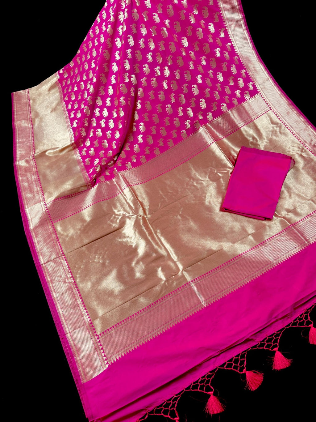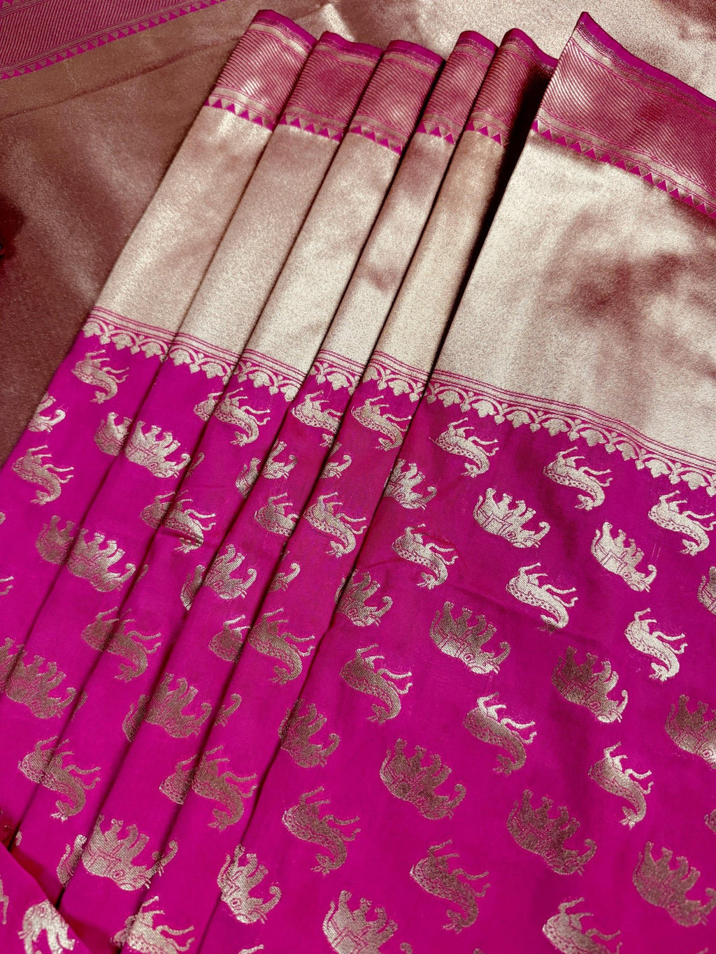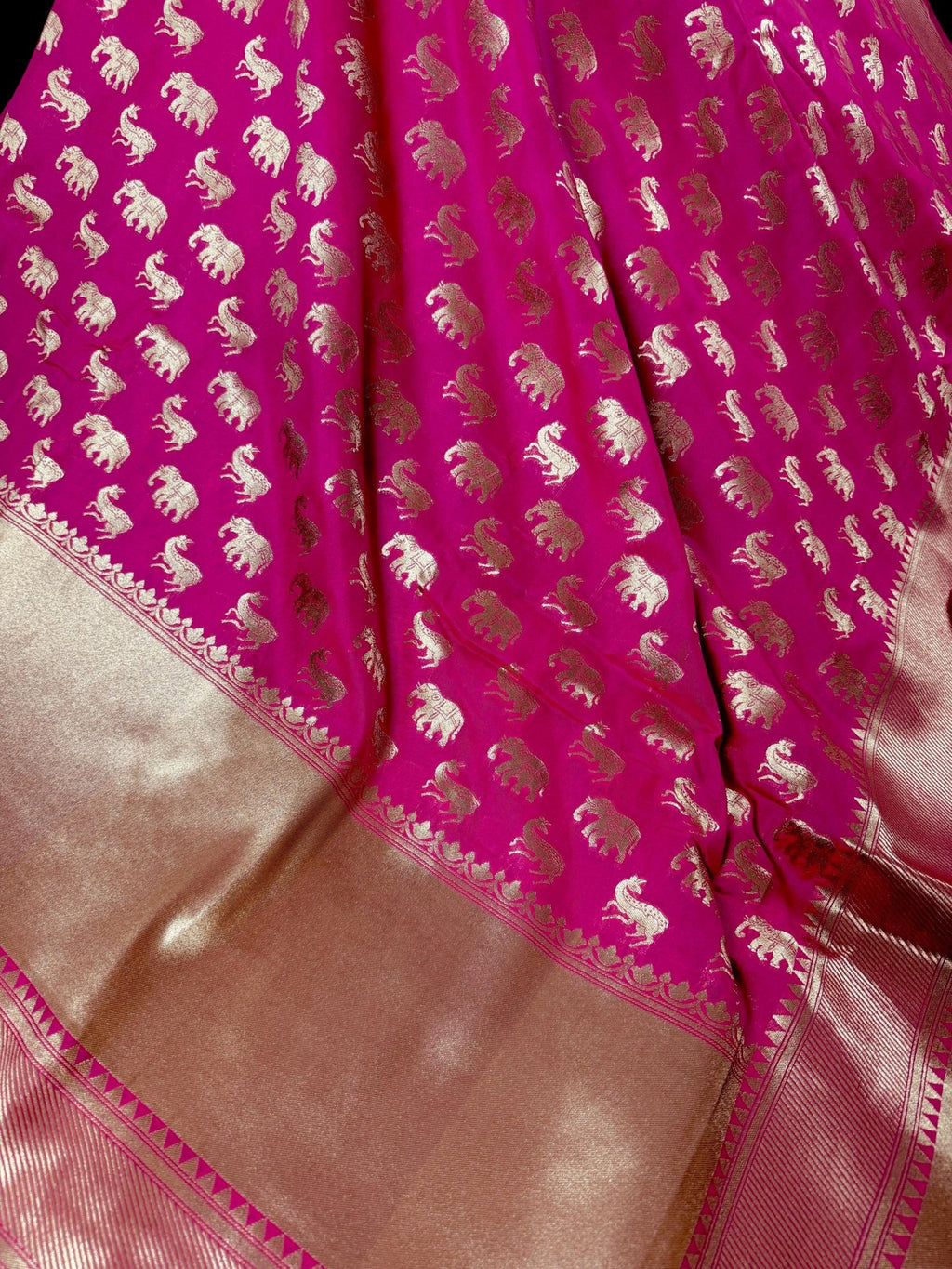 The vibrant hot pink fabric is adorned with exquisite deer and elephant motifs, symbolizing grace and strength, woven directly into the silk. The design is framed by a magnificent wide border and a heavy pallu, showcasing the pinnacle of handloom craftsmanship. Crafted from premium Banarasi soft silk, this saree offers a rich, structured drape that is perfect for brides, wedding guests, and grand festivities.