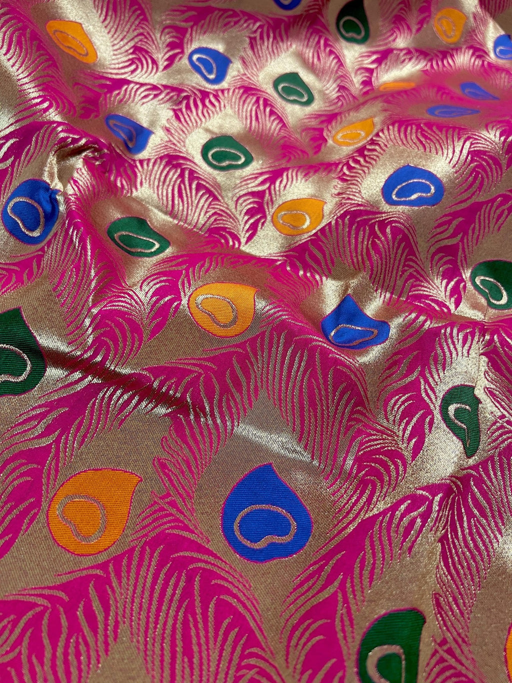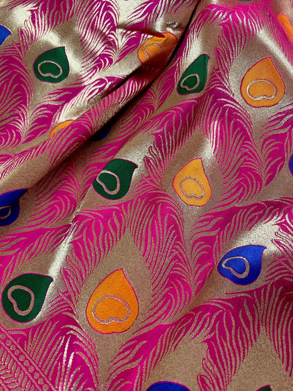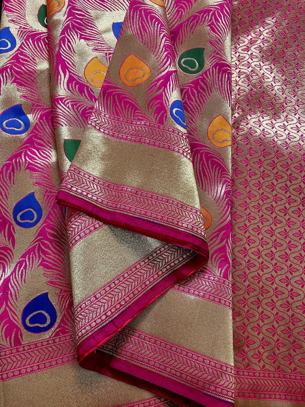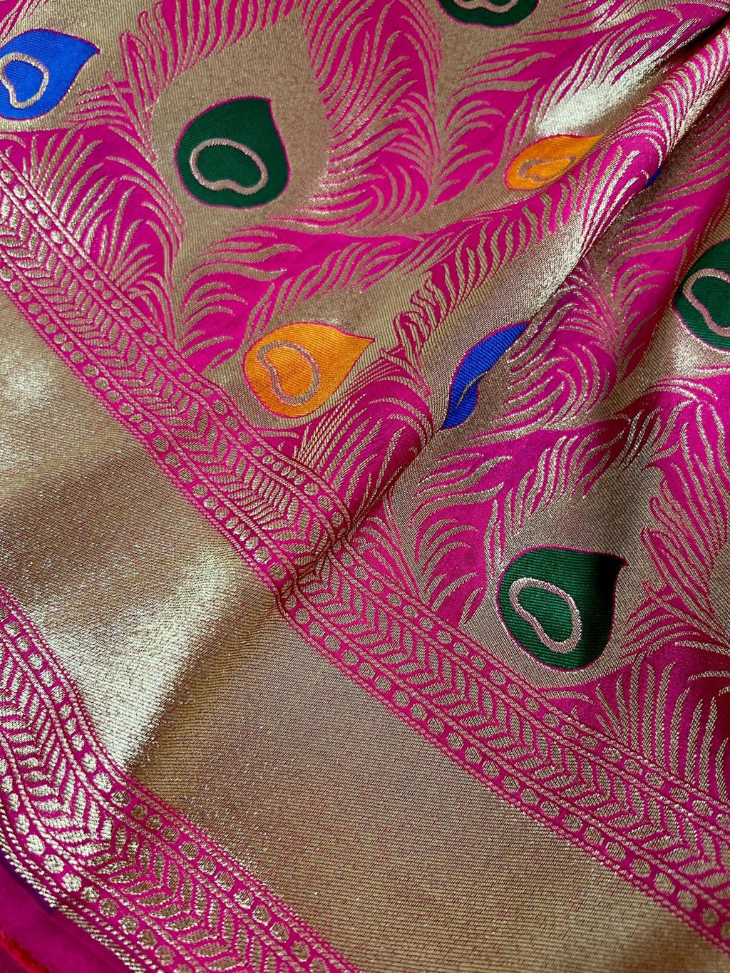 Gorgeous Saree in Peacock Feather Design Pattern in Hot Pink with Gold Zari Weaving