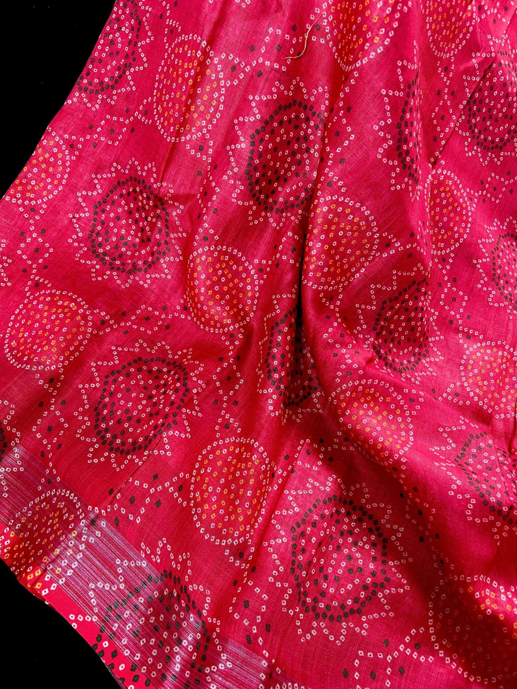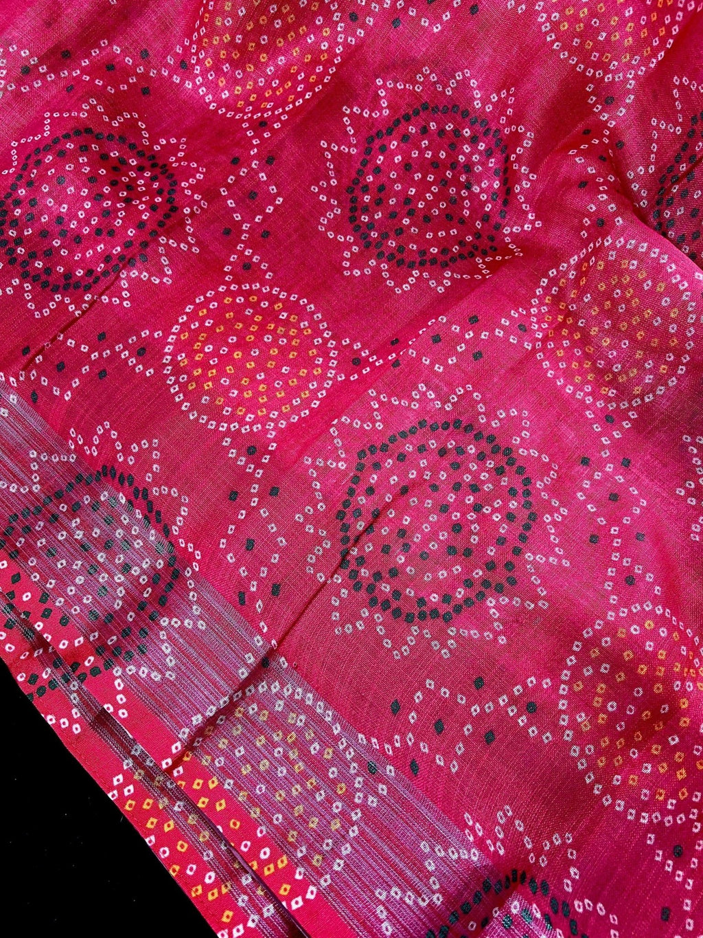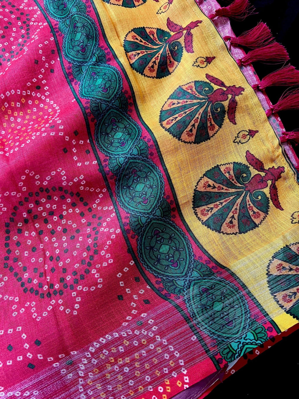 Pink Color Pure Linen by Linen Saree wth Bandhani Digital Prints with Floral Yellow small border.