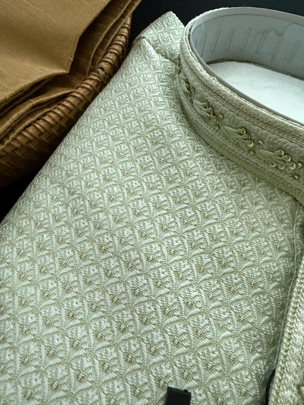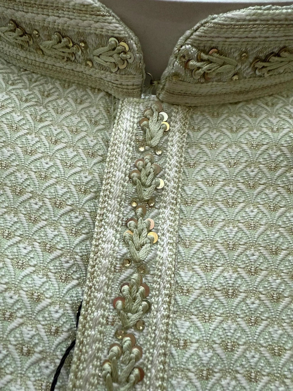 Elevate your traditional style with this Pista Green Men Kurta Pajama Set, crafted with an intricate zari weave and delicate tiny sequins for a refined touch. Perfect for weddings, festive celebrations, parties, or cultural events, this elegant mens ethnic wear set combines comfort with sophistication.