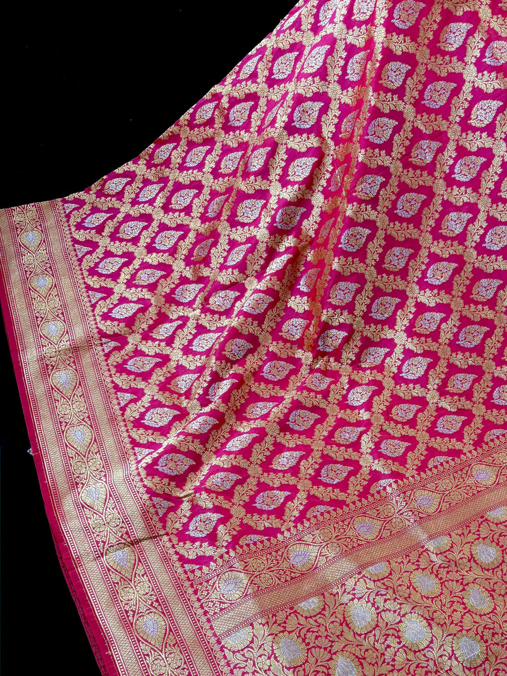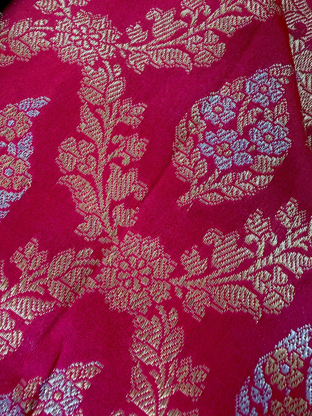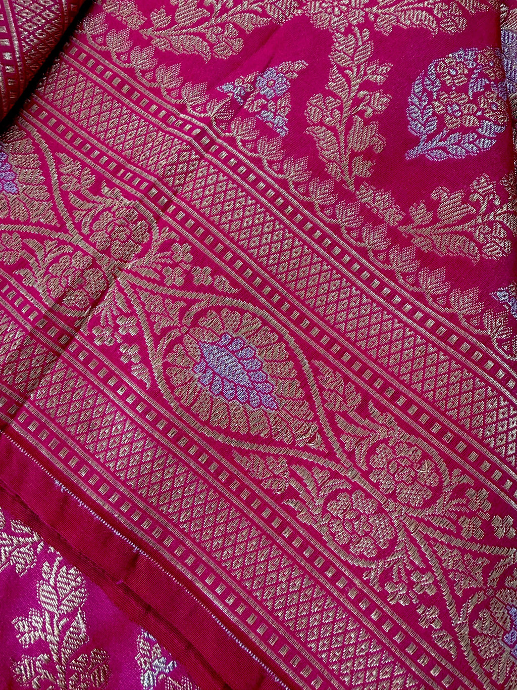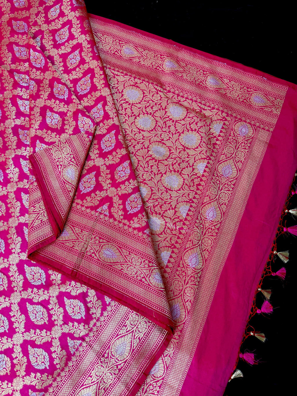 Rani Pink Color Banarasi Handloom Saree | Floral design in Sliver and Gold Zari Weave