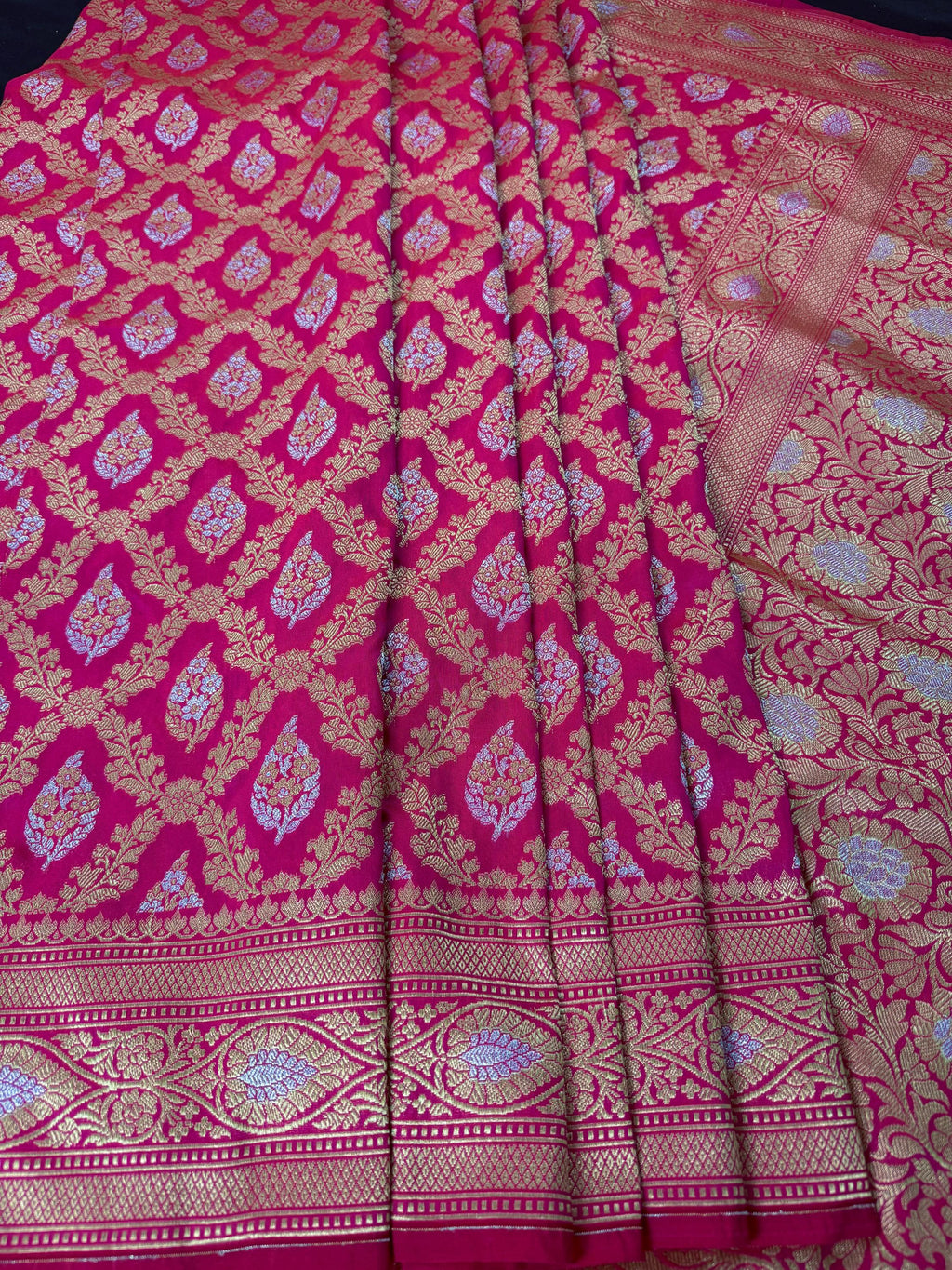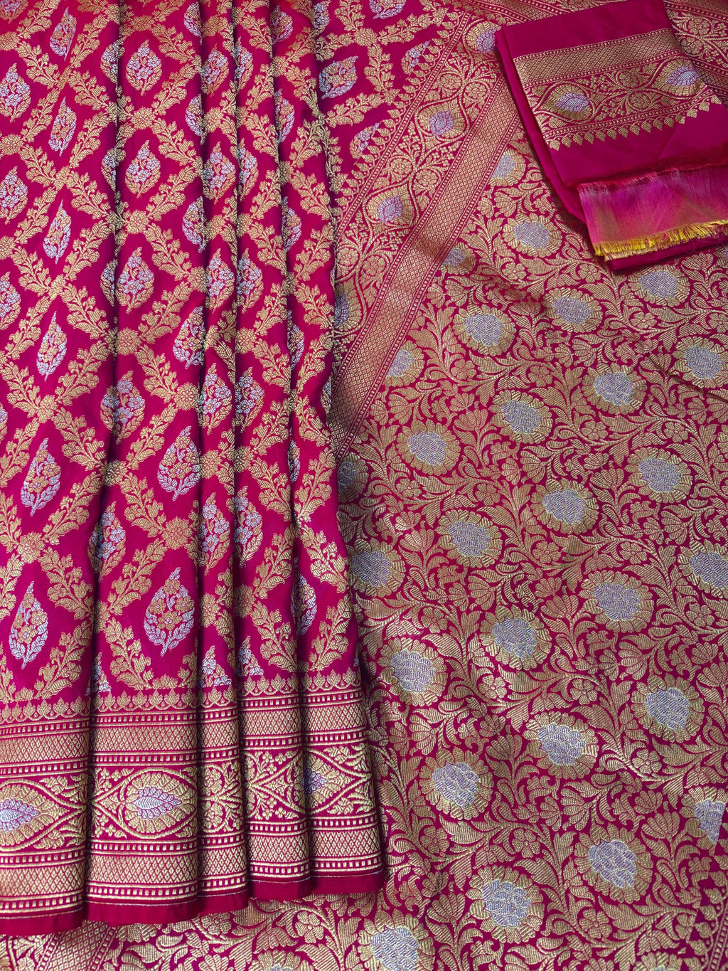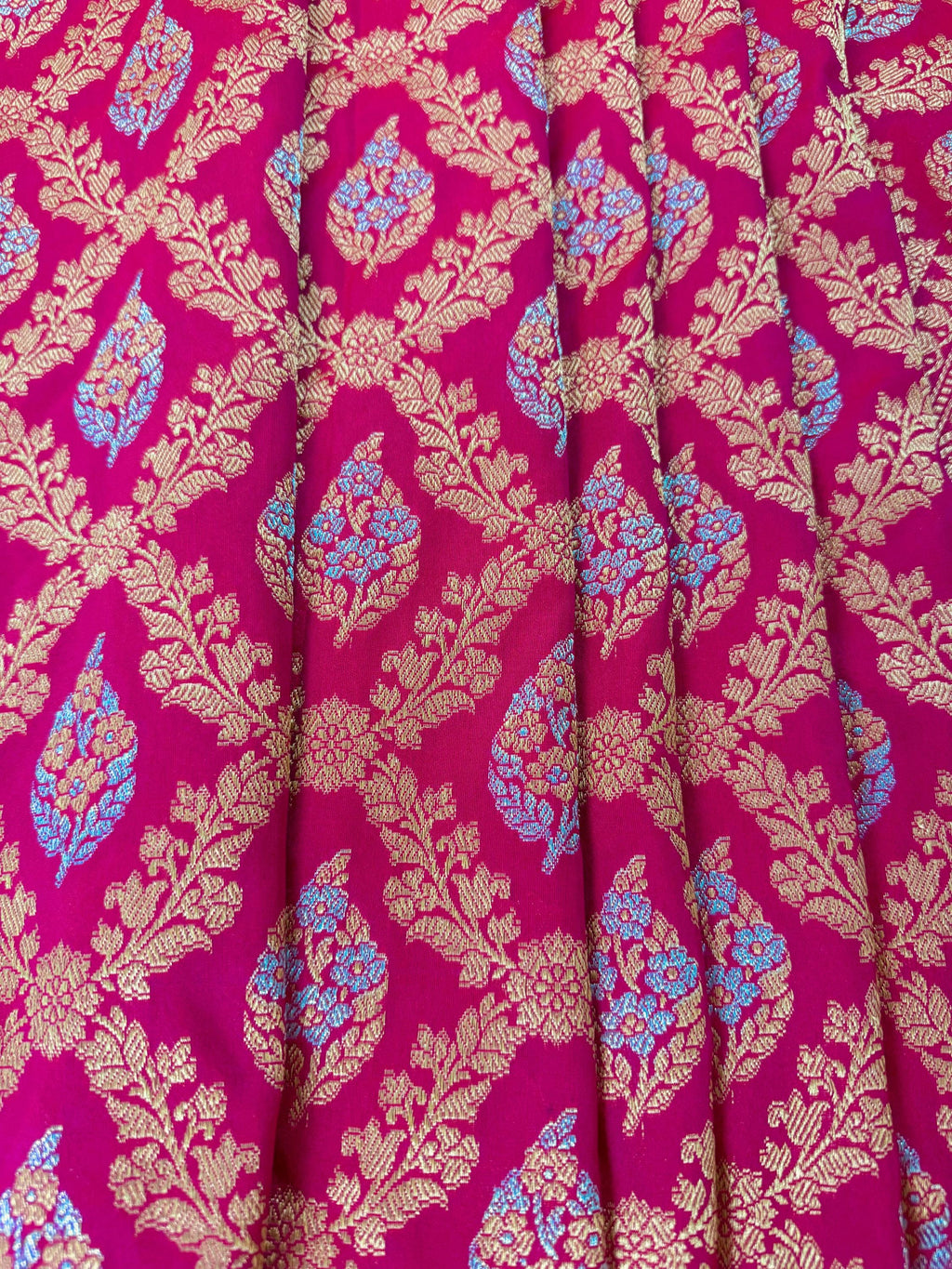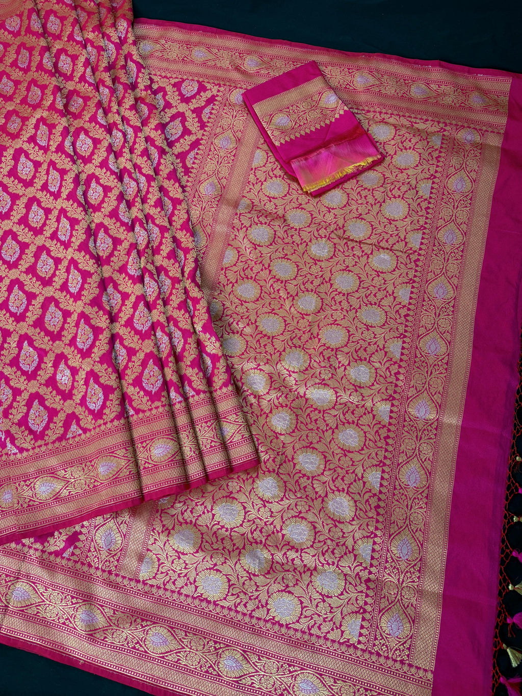 Rani Pink Color Banarasi Handloom Saree | Floral design in Sliver and Gold Zari Weave