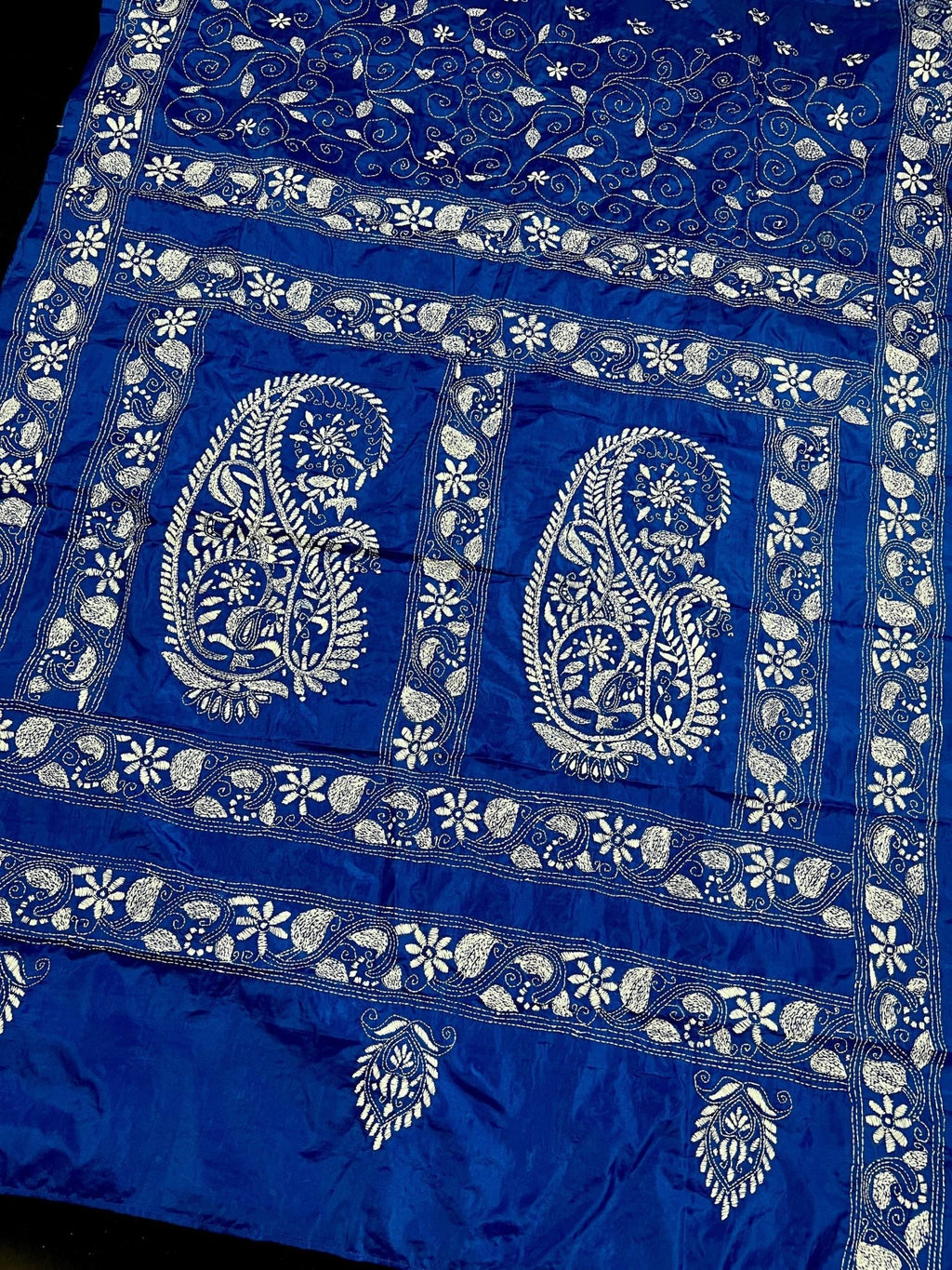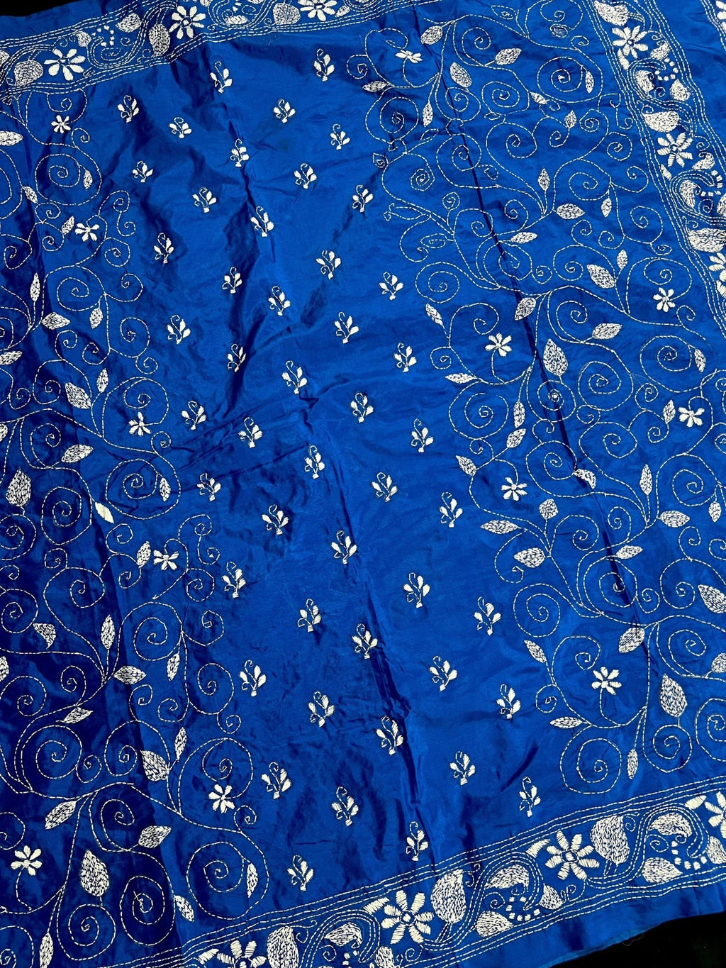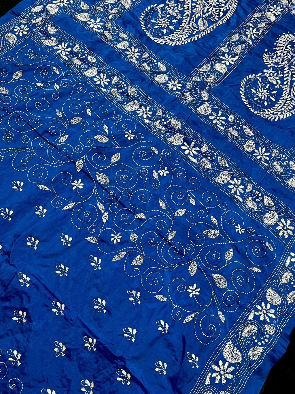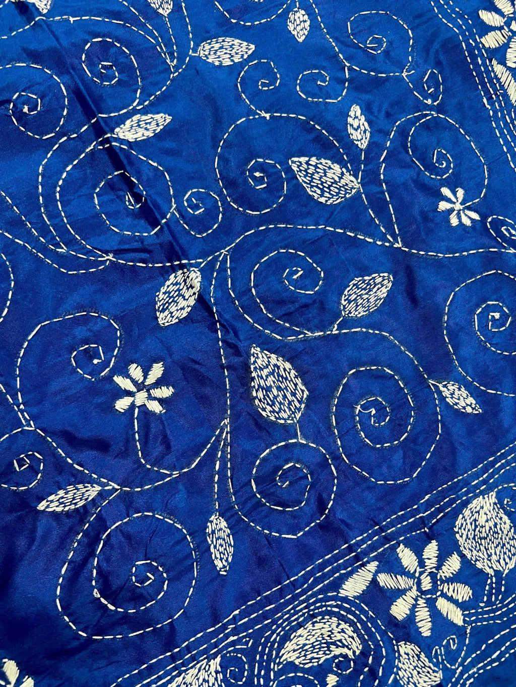 Royal Blue Color Bangalori Silk Saree with Hand Kantha Stitch