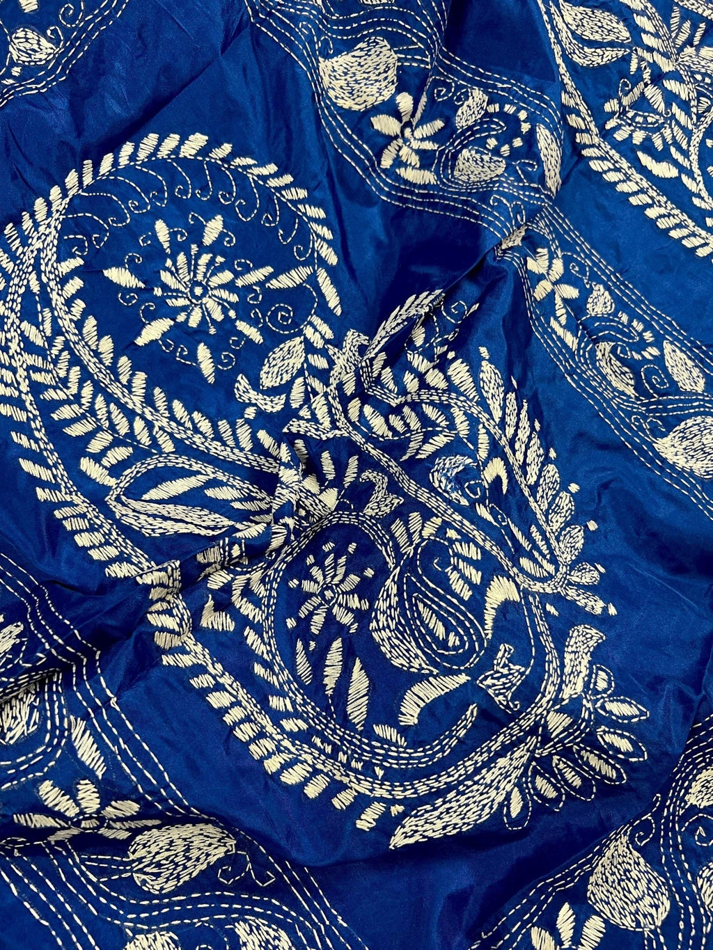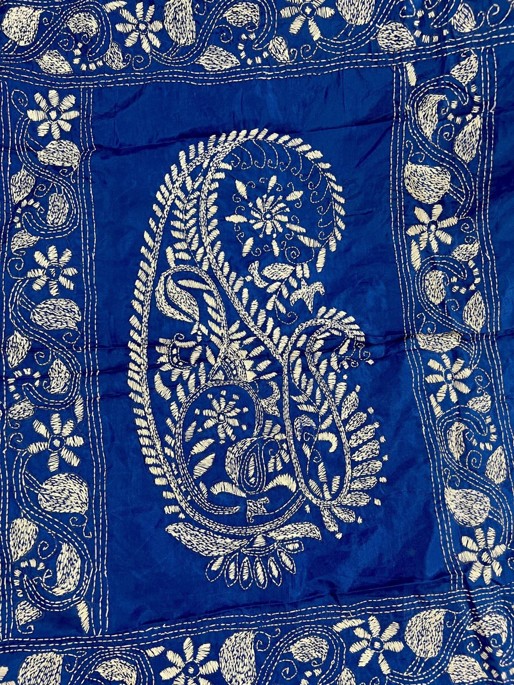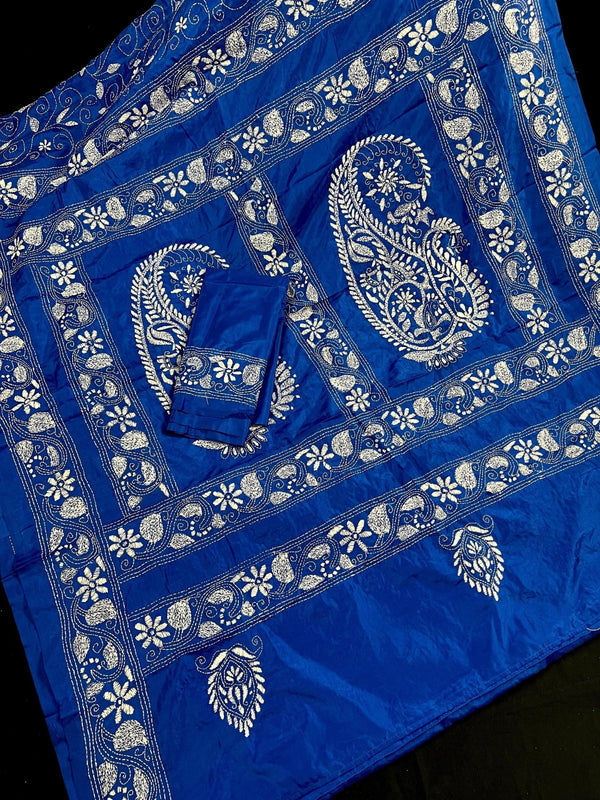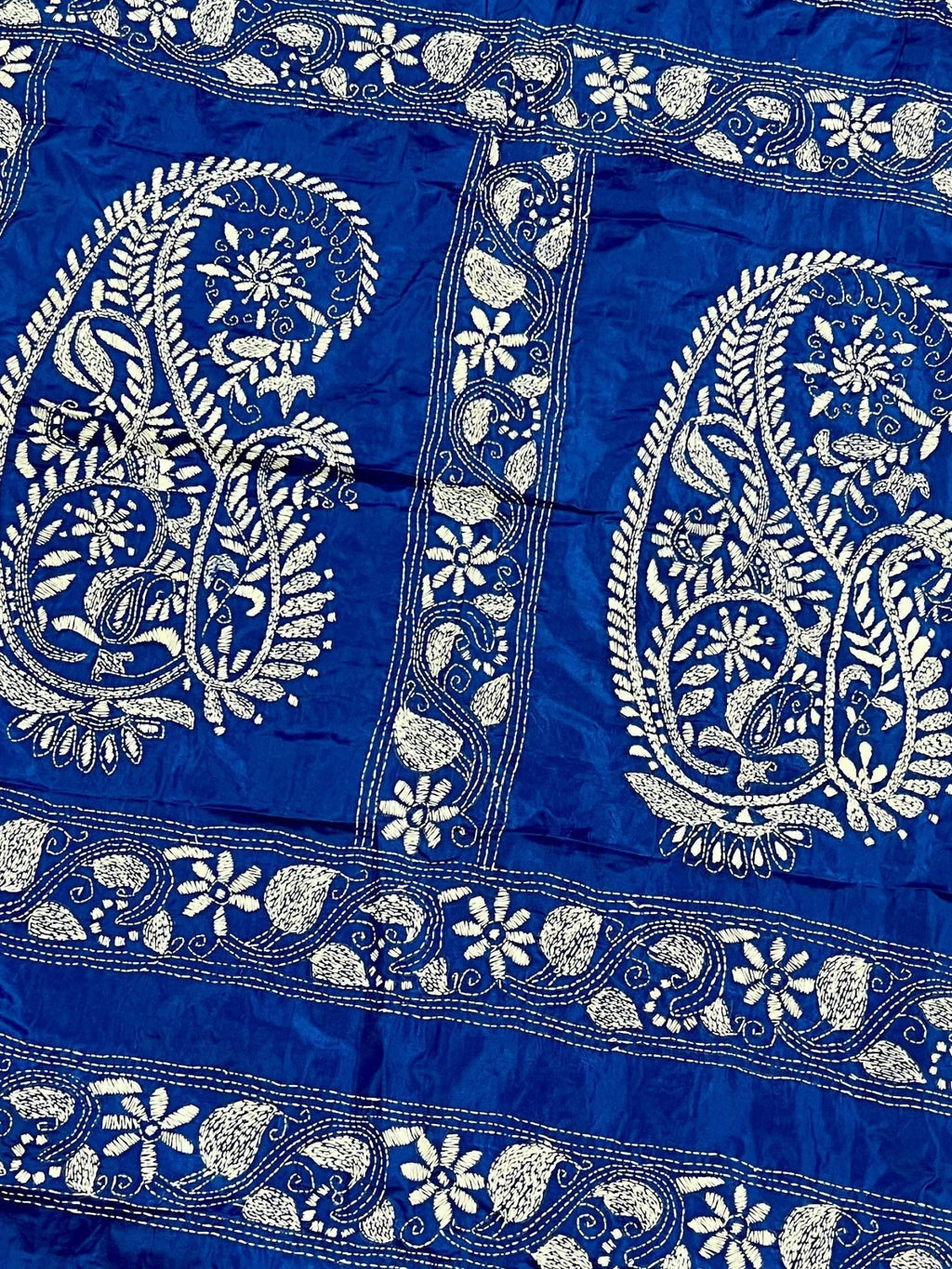 Royal Blue Color Bangalori Silk Saree with Hand Kantha Stitch