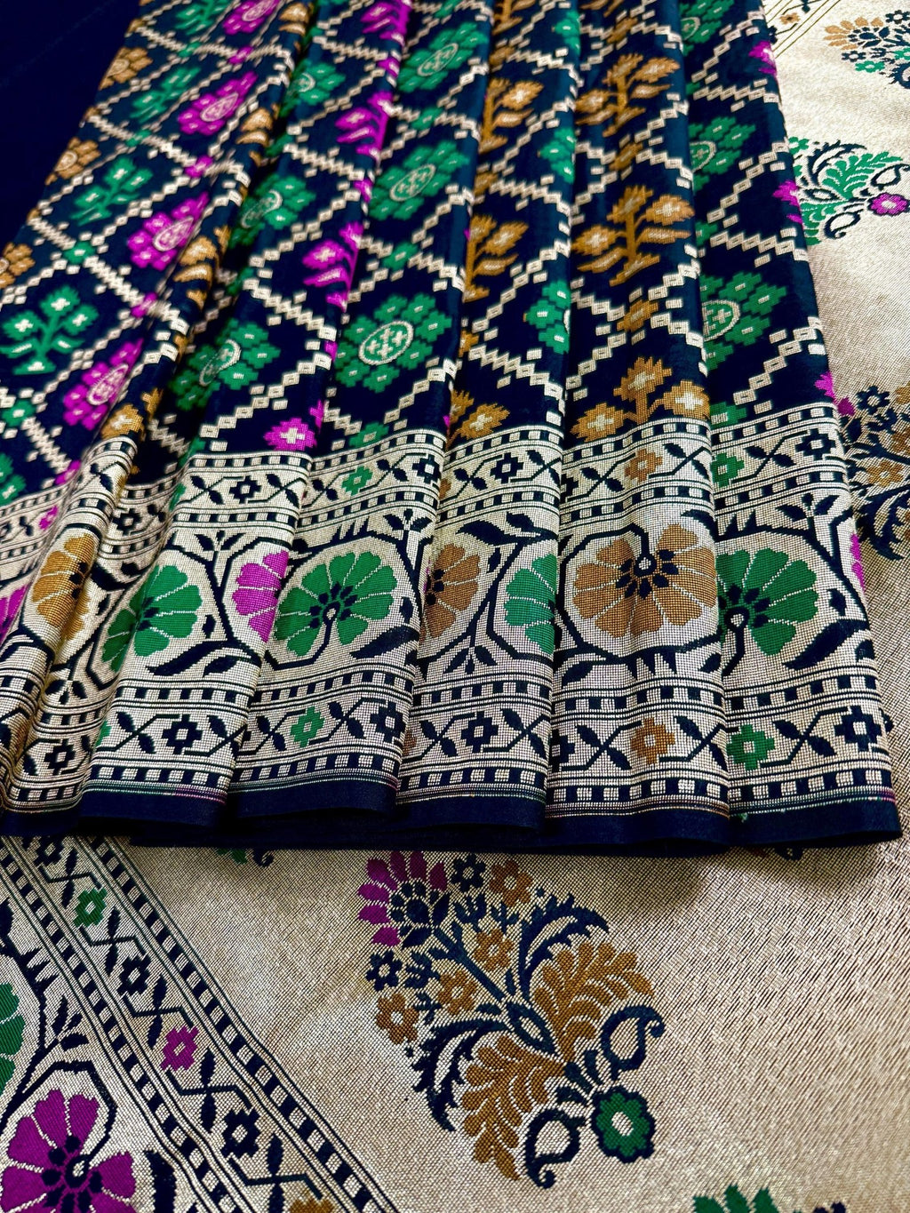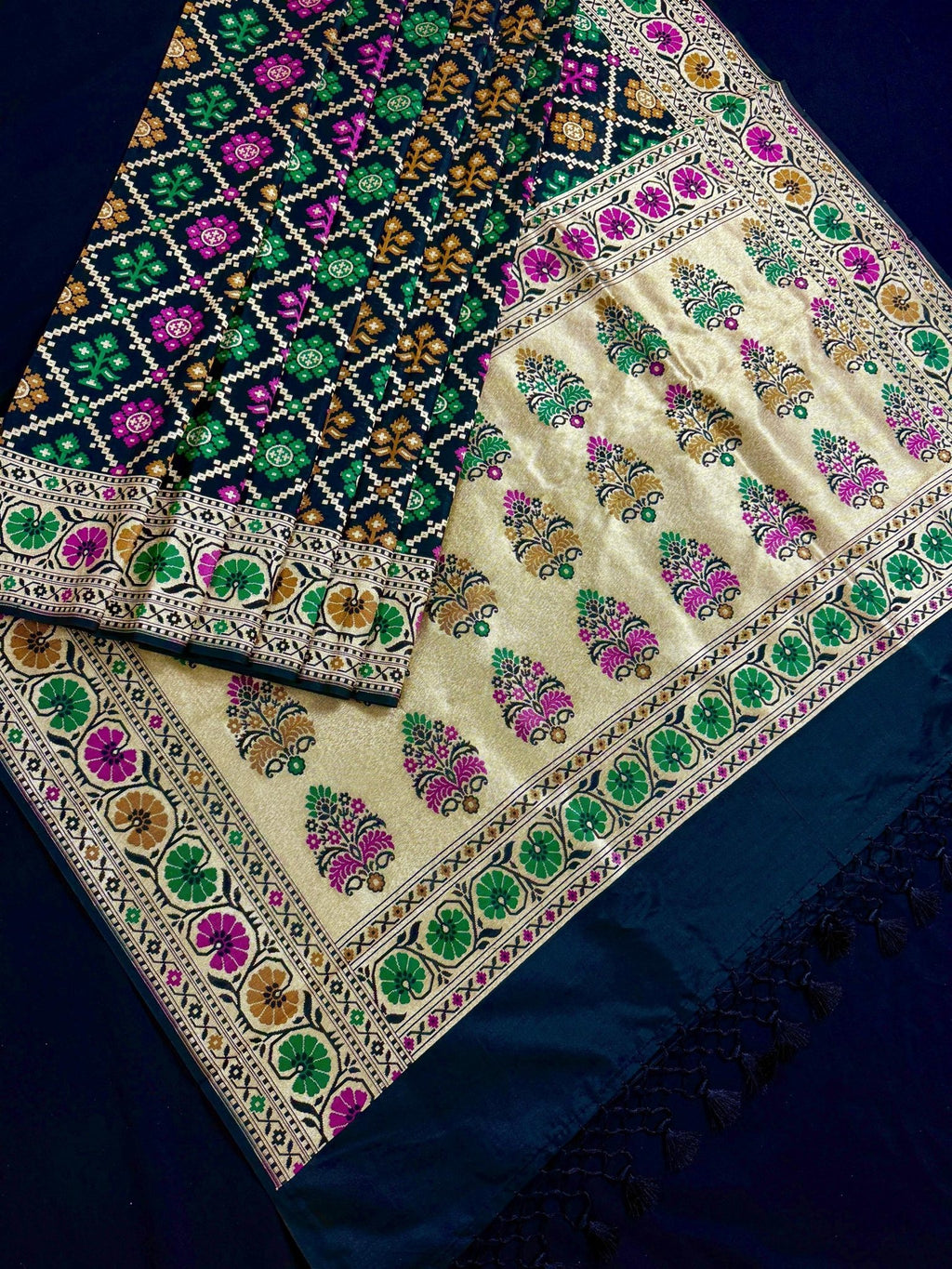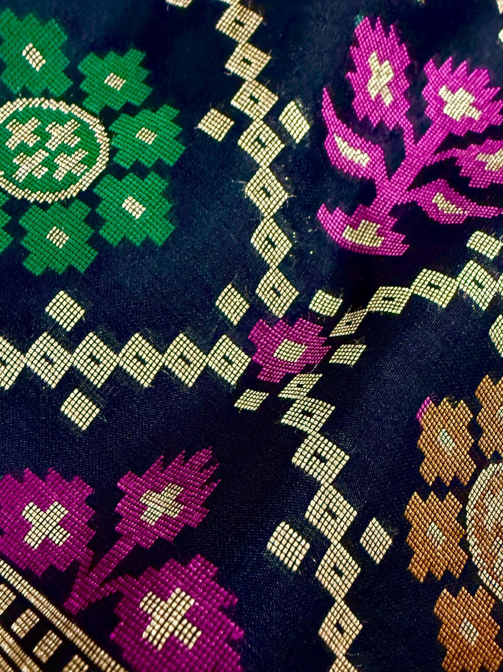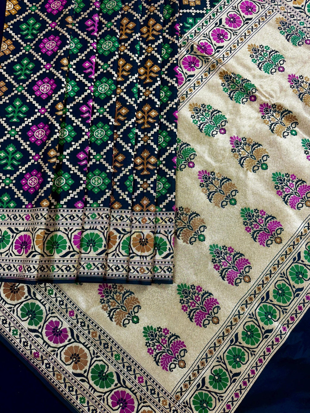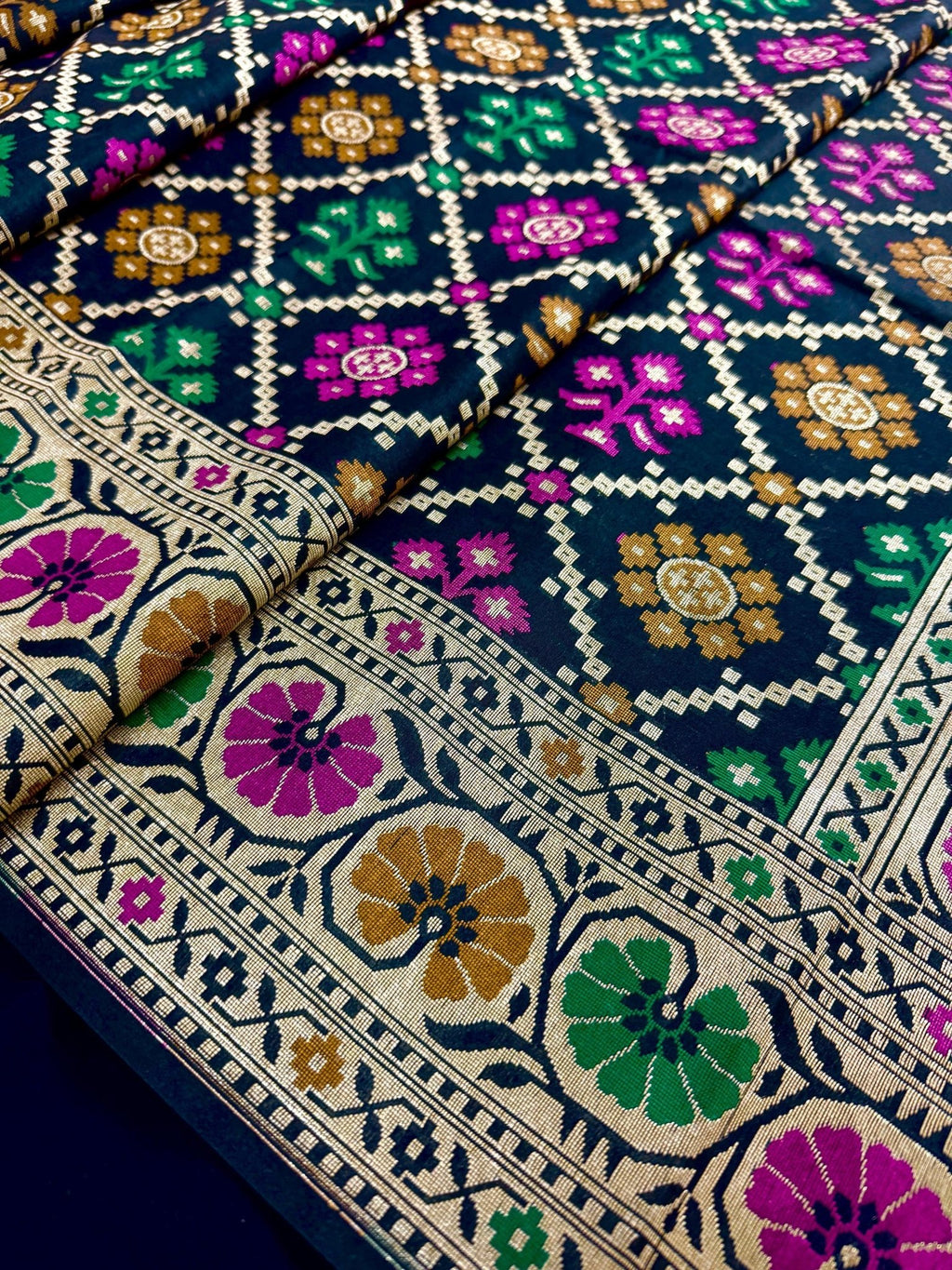 Black Color Banarasi Soft Silk Saree with Patola Pattern and Grand Pallu. Saree is beautifully Weaved with Muted Gold Zari and Meenakari.