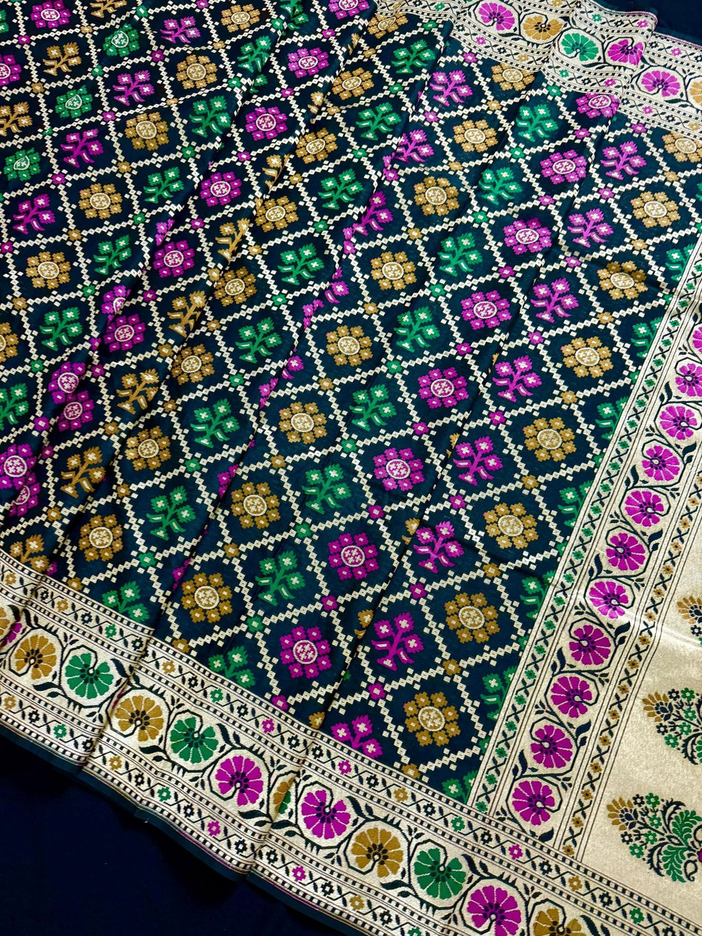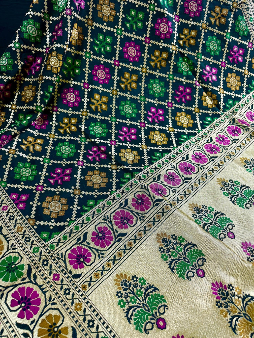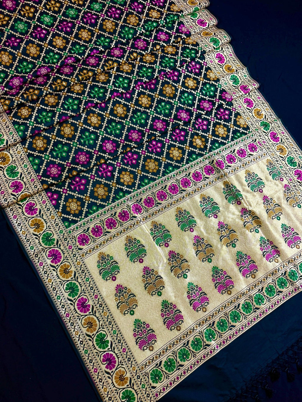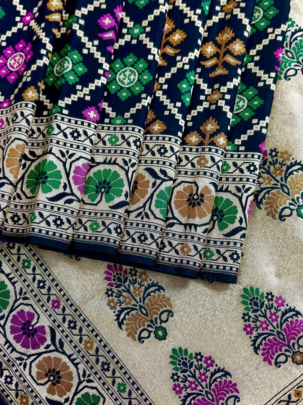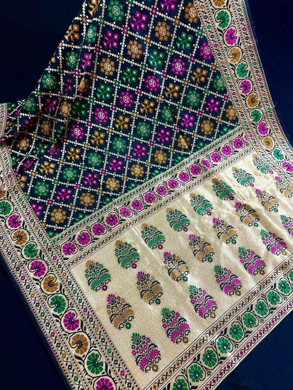 Black Color Banarasi Soft Silk Saree with Patola Pattern and Grand Pallu. Saree is beautifully Weaved with Muted Gold Zari and Meenakari.