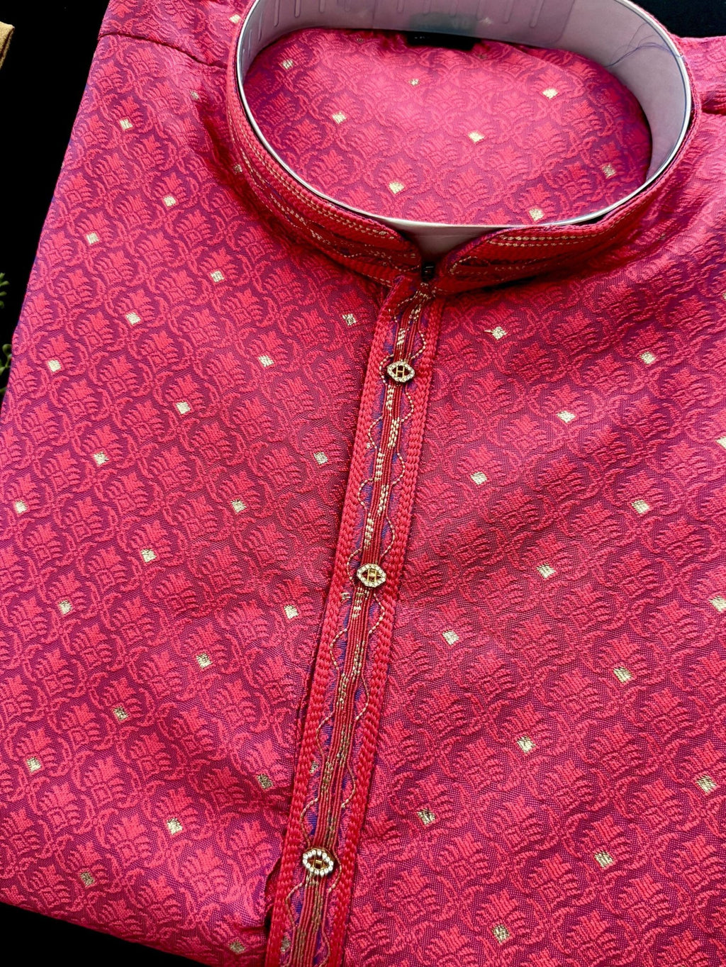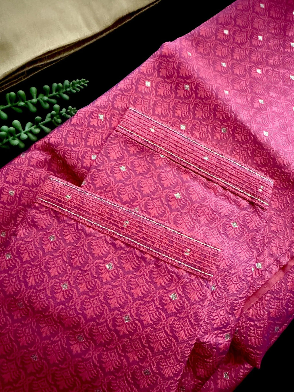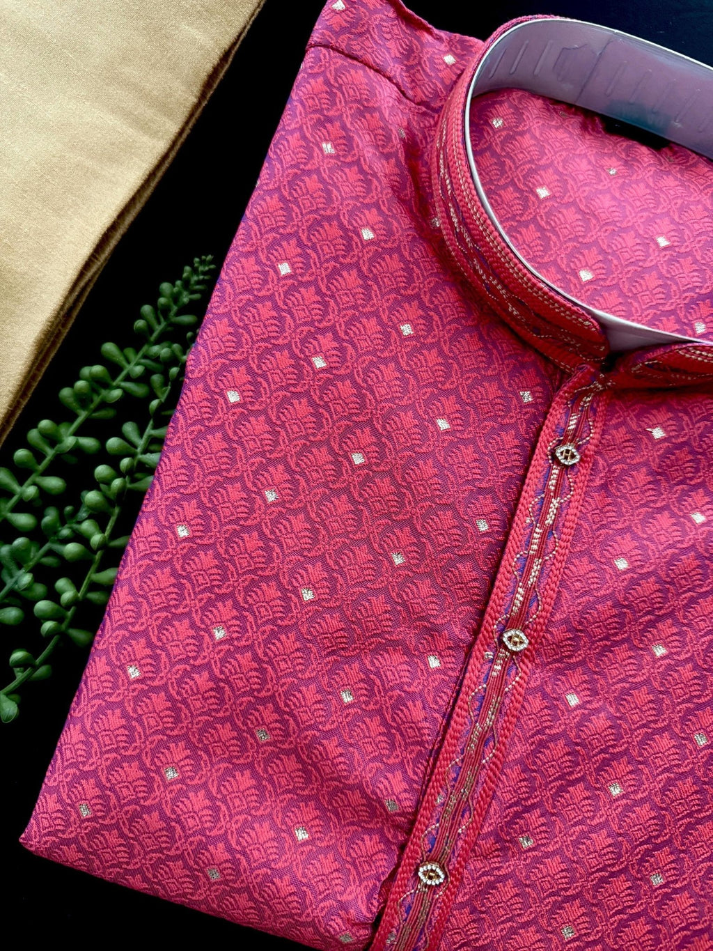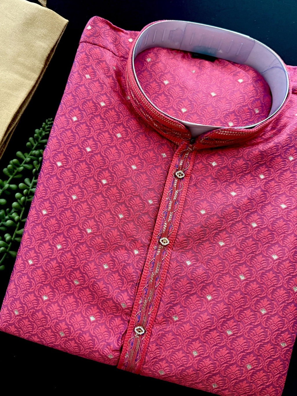 Elevate your ethnic wardrobe with this Strawberry Pink Color Soft Raw Silk Men Kurta Pajama, crafted with rich texture and elegance. Made from premium soft raw silk, this kurta pajama set features an elegant self-design with subtle tiny zari weave, adding just the right touch of festive shimmer. The intricate detailing makes it a perfect choice for party wear men ethnic wear and special celebrations.