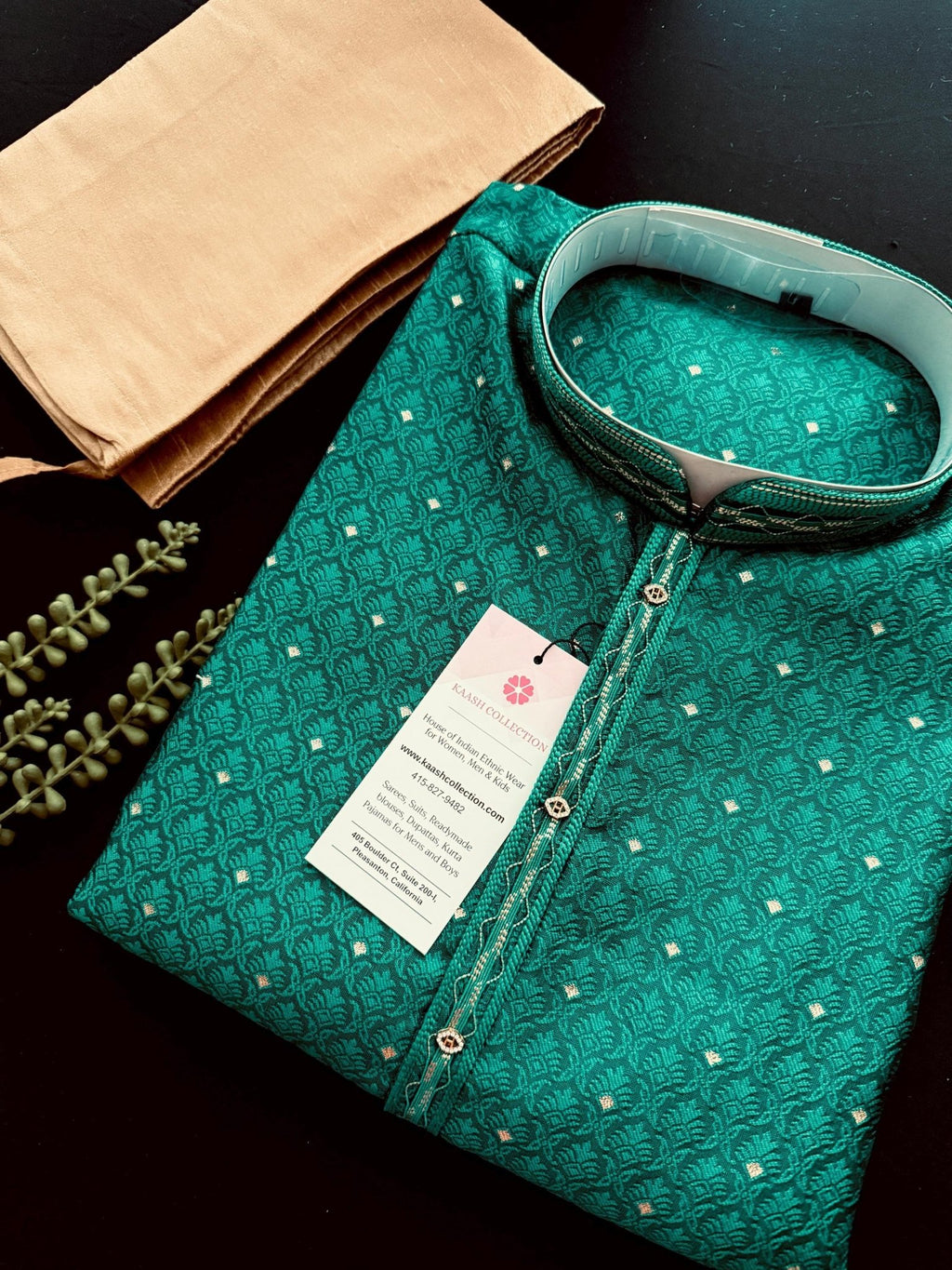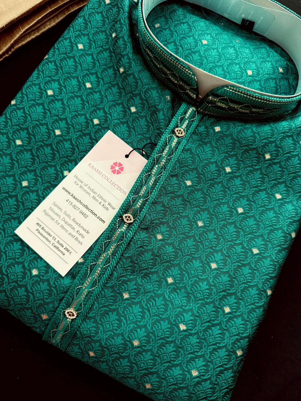 Teal Green Color Soft Raw Silk Men Kurta Pajama Self Design and tiny Zari Weave